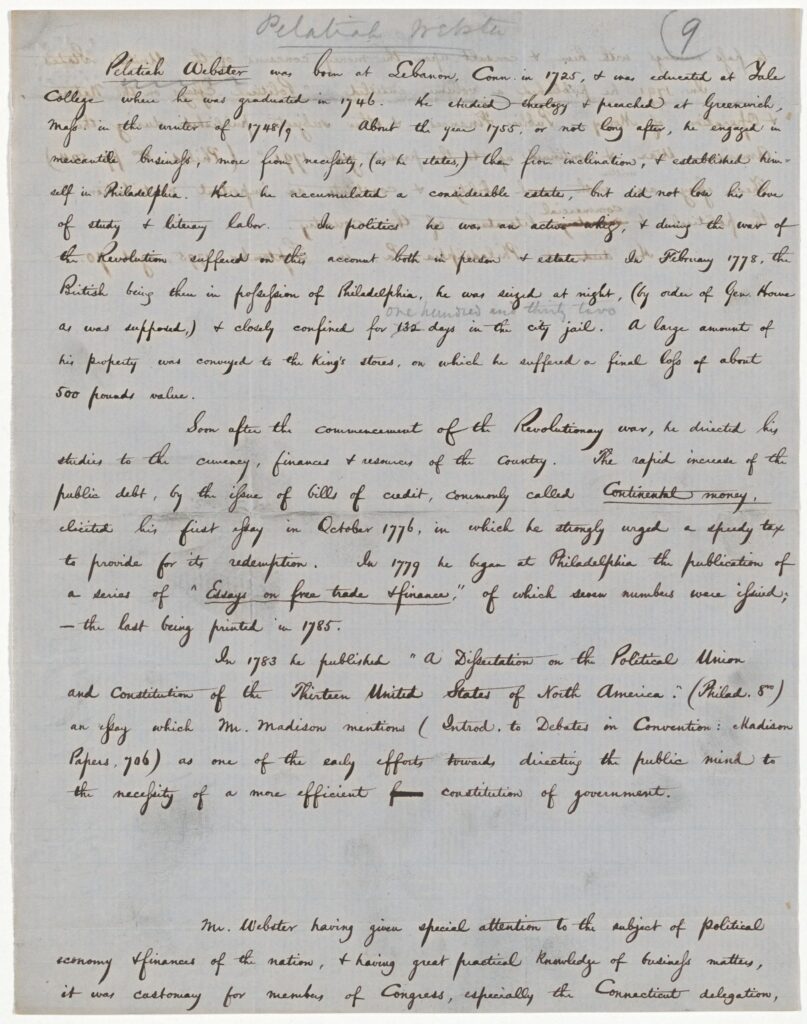 According to this biographical correspondence between two people from the 1800’s even James Madison mentioned that Pelatiah started one of the early efforts towards directing the public mind to a more efficient constitution of government.