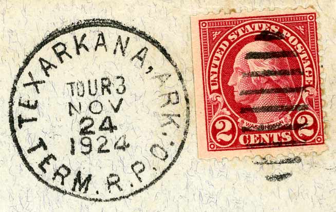 Postmark from Terminal Railway Post Office in Texarkana, Arkansas dated November 24, 1924 Image via Wikimedia Commons, public domain