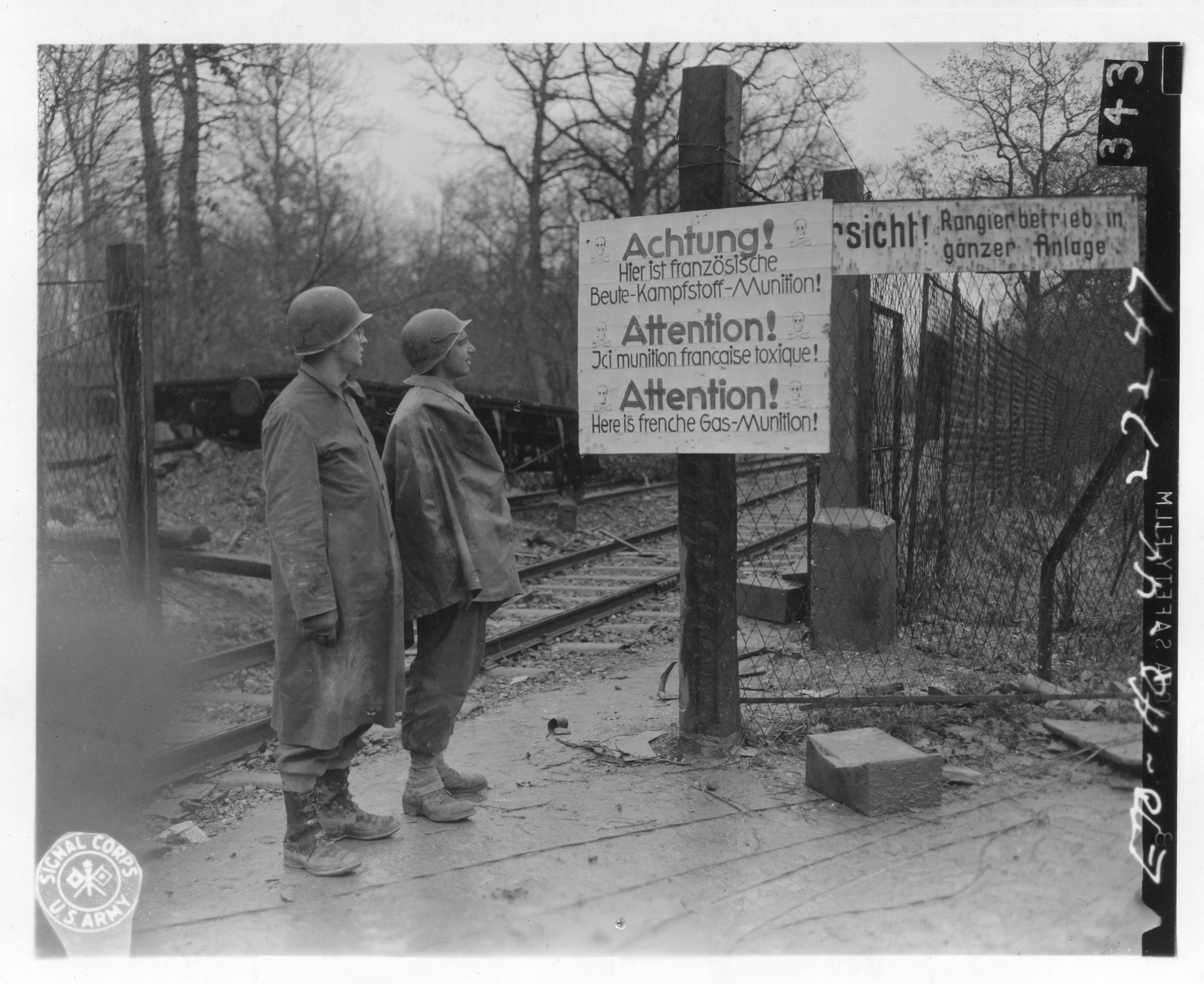 Warning sign posted near German gas and munition dump in Metz, France November 24, 1944 Image via Wikimedia Commons, public domain