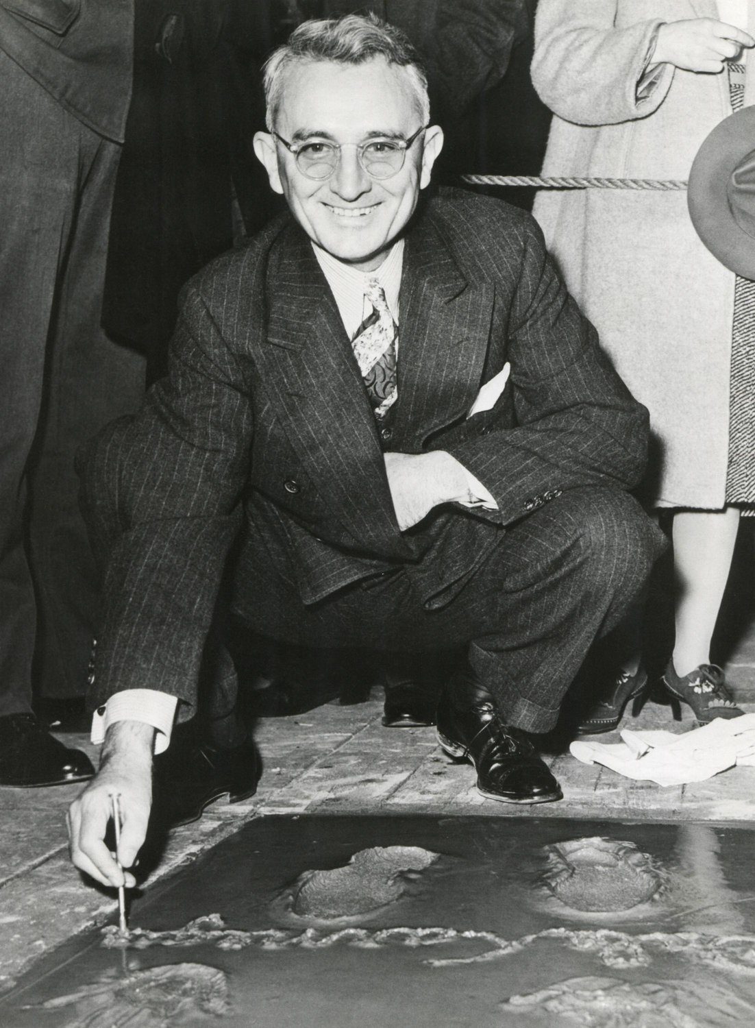 Dale Carnegie, signing his concrete slab at Grauman’s Chinese Theatre. His book, ‘How To Win Friends and Influence People’ of 1936 is a classic and still relevant self-help book. Dale was born on November 24, 1888 in Maryville, Missouri. Image via Alamy