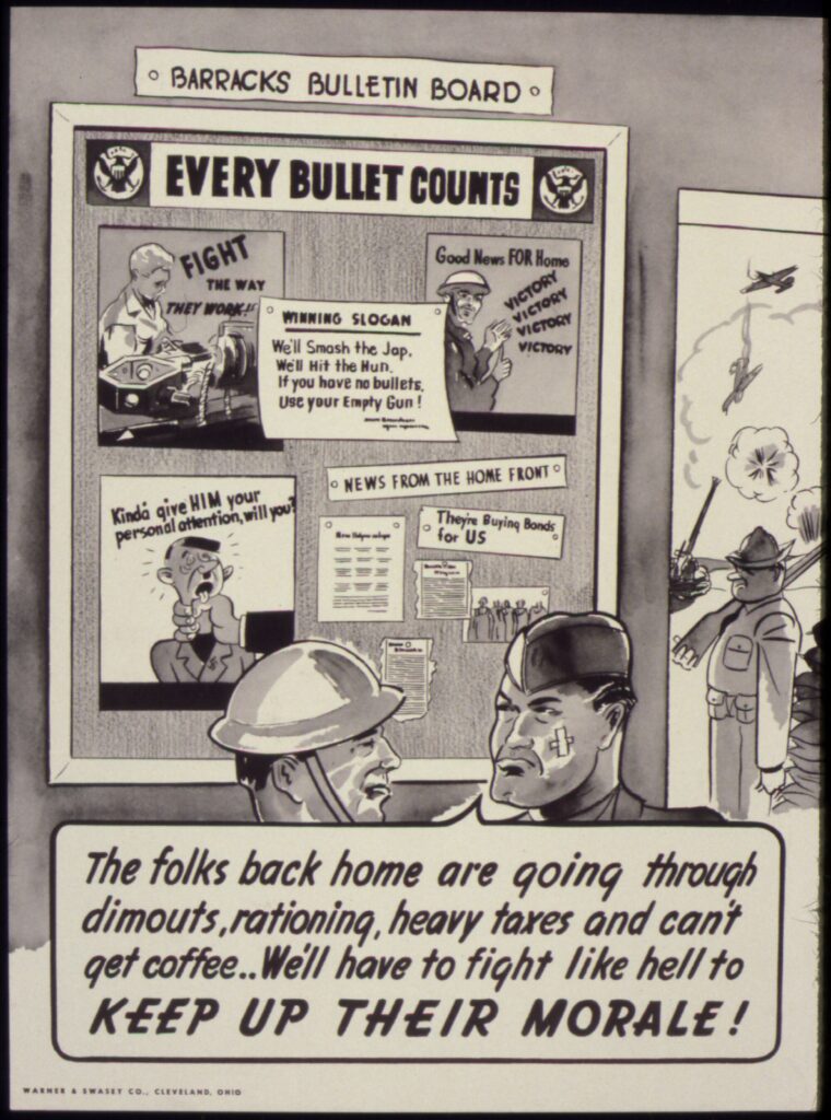 The folks back home are going through dimouts, rationing, heavy taxes and can’t get coffee… We’ll have to fight like hell to keep up their morale!