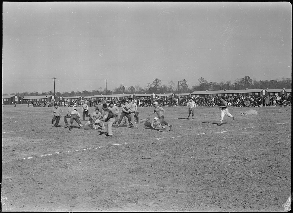 In the shadow of wartime confinement, Japanese American incarcerees gather on a dusty field to play football—an act of resilience, camaraderie. The Jerome Relocation Center, one of ten War Relocation Authority camps, held over 8,000 people forcibly removed from their homes. Amid rows of barracks and watchful eyes, this game offered a rare moment of joy and community, echoing the American spirit even in exile.
