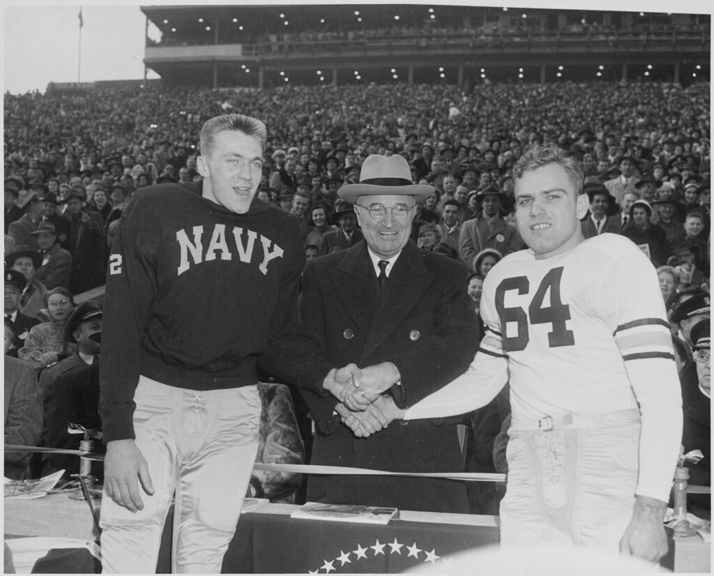 Before kickoff, President Harry S. Truman shook hands with the team captains in a moment of national pageantry and pride.