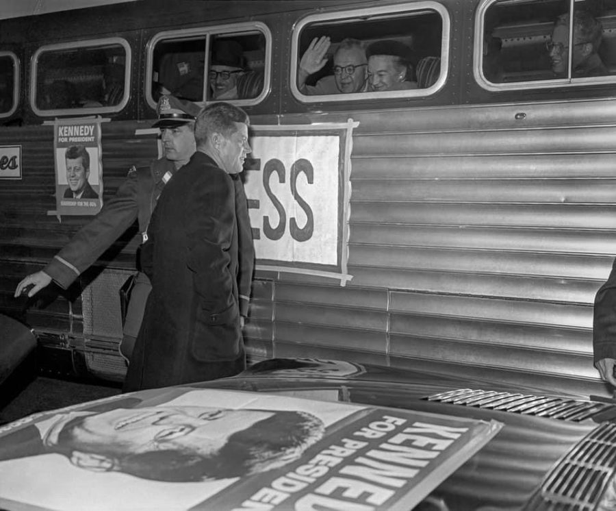 JFK walks by a bus the night before the presidential election Boston, Massachusetts – November 7, 1960 via Alamy