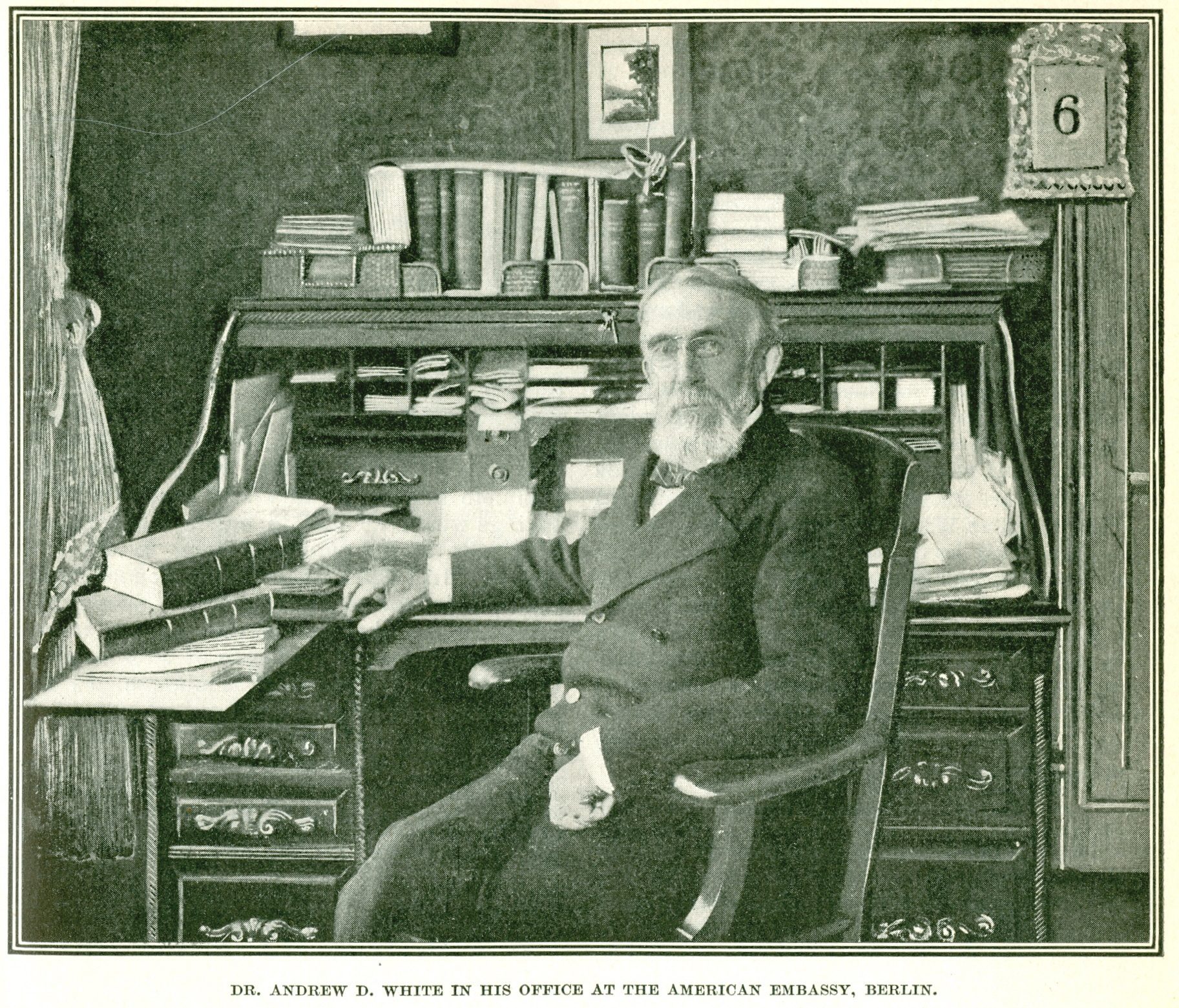 American historian, U.S. Ambassador, cofounder and 1st President of Cornell University, Andrew Dickson White, was born on November 7, 1832 in Homer, New York. During his lifetime, White amassed a collection of over thirty-thousand books. His second wife, Helen Magill, was the first woman to earn a Ph.D. in the U.S. Image of Dr. Andrew D. White in his office at the U.S. Embassy in Berlin from Political Graveyard via Wikimedia Commons, CC BY 2.0