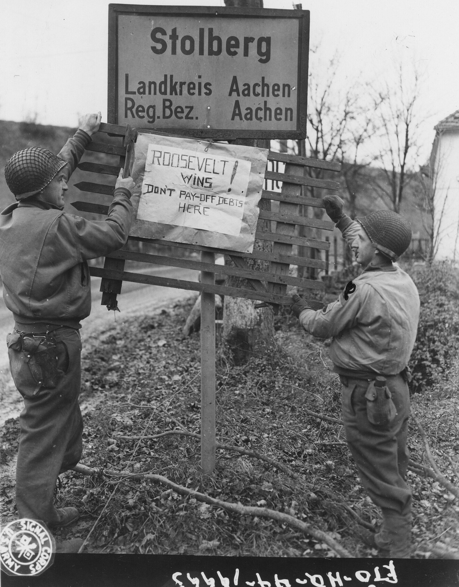 American soldiers at an intersection in Germany post election results “Roosevelt Wins!” from November 7, 1944 Image via Wikimedia Commons, public domain
