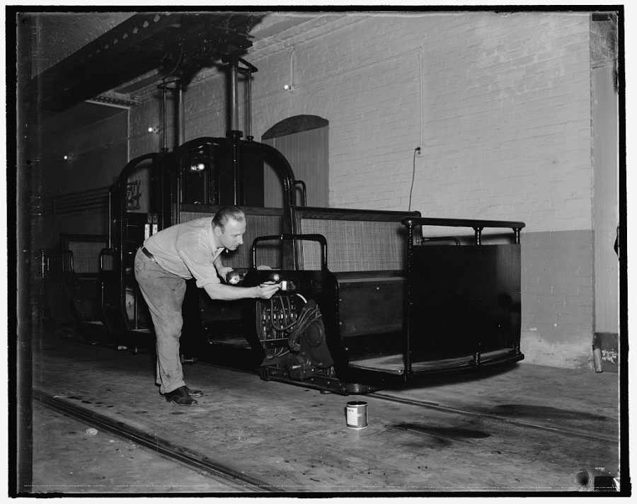 Title: “Tram cars readied for senators. Washington, D.C., Nov. 9. The tram cars used by the senators in going thru the subway from their offices to the Capitol have been given a new coat of paint and an engine overhauling in readiness for the special session…” 11/9/1937 via Library of Congress, no known restrictions