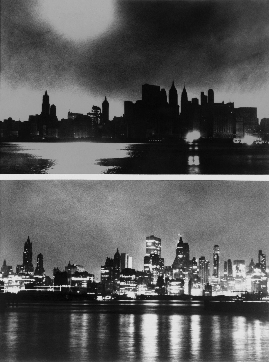 During and after photos of New York City’s Manhattan skyline November 9-10, 1965, when the blackout occurred for 13 hours in the Northeast United States and Canada. Image via Alamy