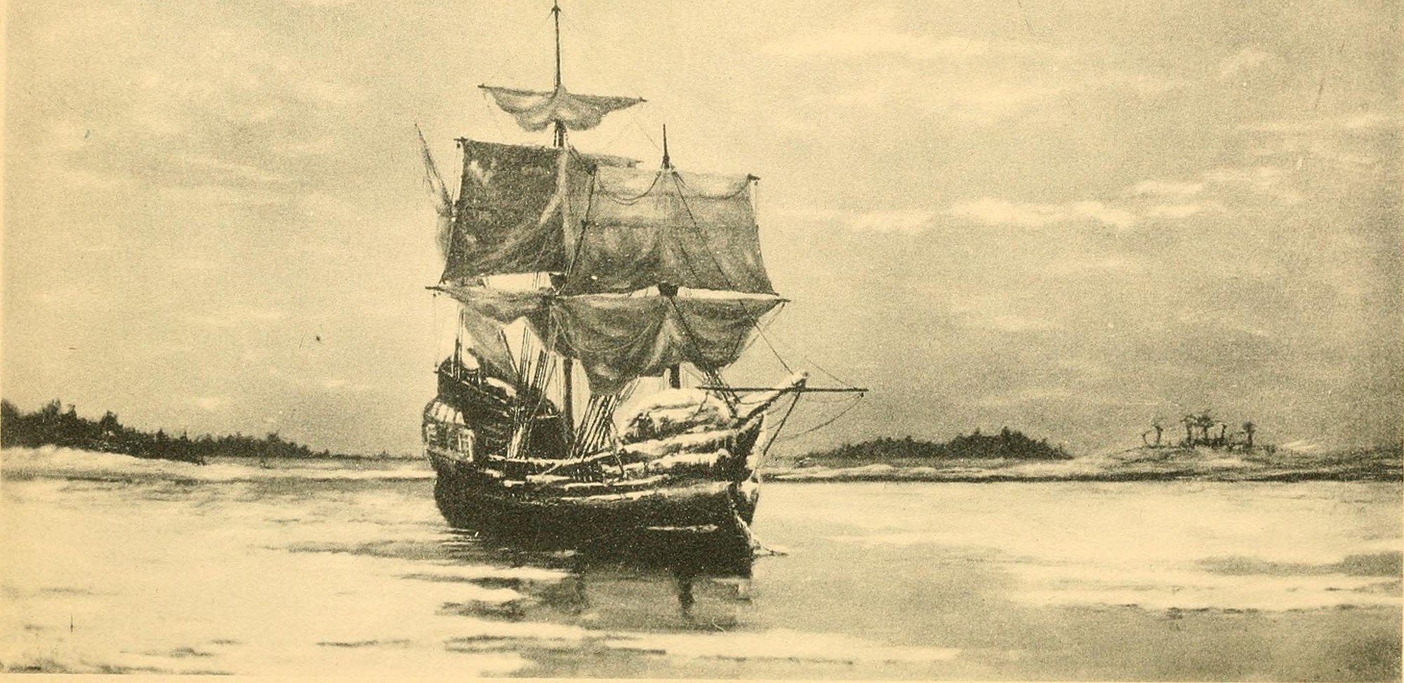 On November 9, 1620, the pilgrims aboard the Mayflower sight Cape Cod. Sketch from a book published in 1901 via Wikimedia Commons, no known restrictions