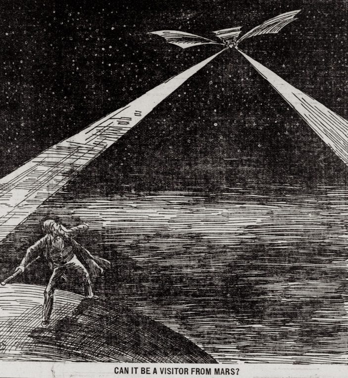Spine-Tingling History Between 1896 and 1897 numerous sightings of a mysterious airship or airships were reported in local newspapers throughout the United States. Besides seeing unexplained moving lights some claimed to have even heard singing as the unidentified flying object flew by them. (Inspiration for the vocalizations by the soprano in the opening theme for Star Trek? ♂️) Even more bizarre was a report near Springfield, Missouri of the ship’s pilots who supposedly appeared to be a man and woman wearing no clothing. Image: Mystery airship art in The Saint Paul Globe from 1897 via Wikimedia Commons, public domain