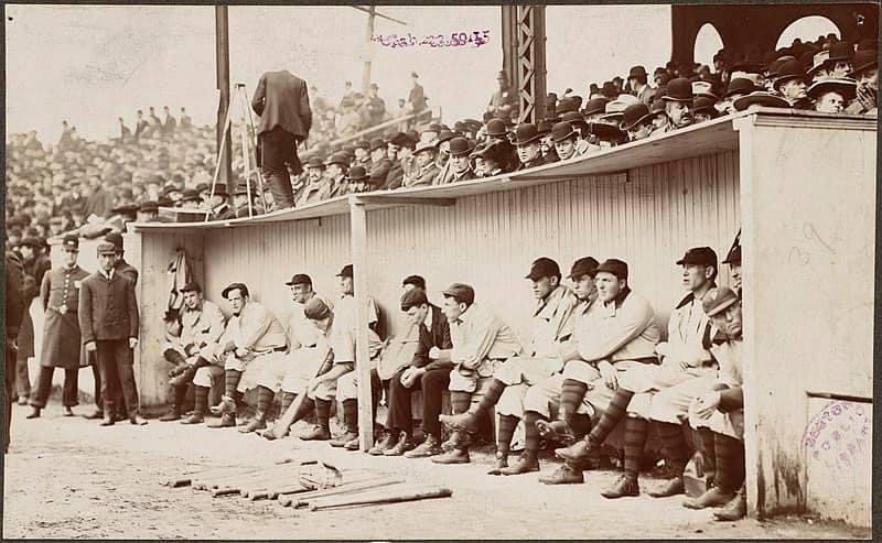 Honus Wagner and other Pittsburgh Pirates in the dugout during the first modern World Series in October 1903. On October 13, 1903 Game 8 (the final game) ended when pitcher Bill Dinneen of the Boston Americans struck out Honus Wagner to win the series. Image via Wikimedia Commons, public domain