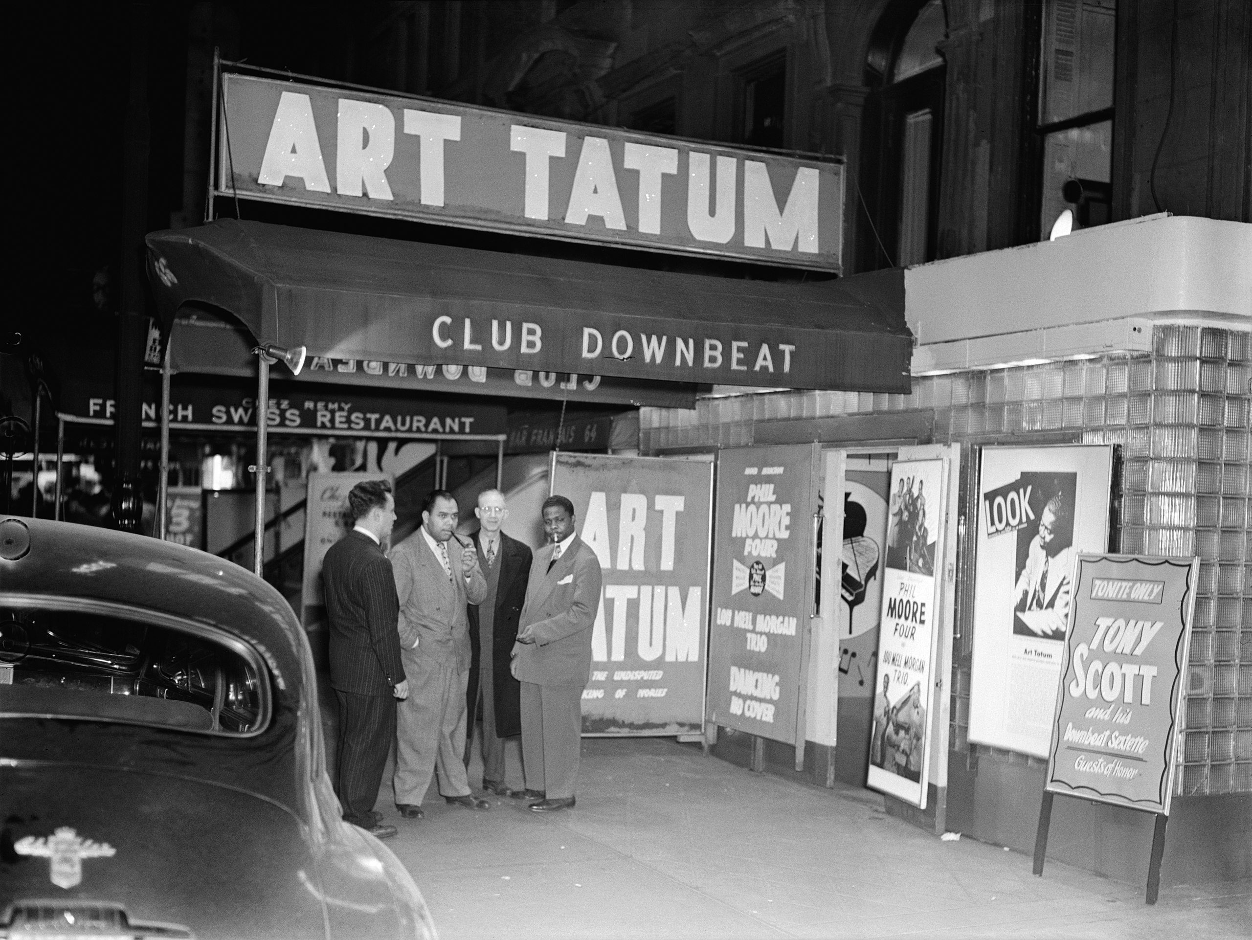 Art Tatum (on the right) standing with others outside the Downbeat Club in New York City in 1947. Tatum is considered to be one of the greatest American Jazz pianists of all time. He was born on October 13, 1909 in Toledo, Ohio. Image via Wikimedia Commons, no known restrictions