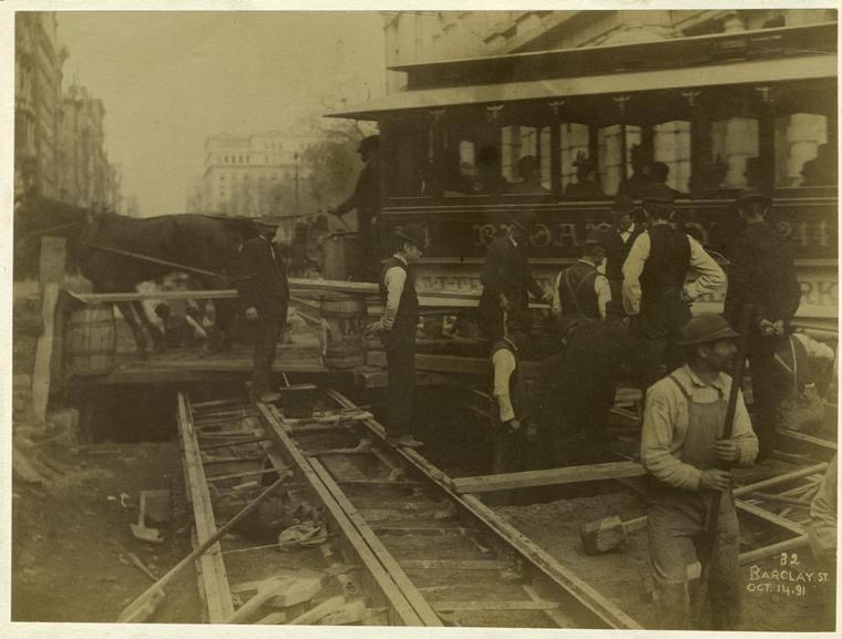 Construction workers continue the job as a horse drawn trolley filled with passengers squeezes by them on Barclay Street in New York City