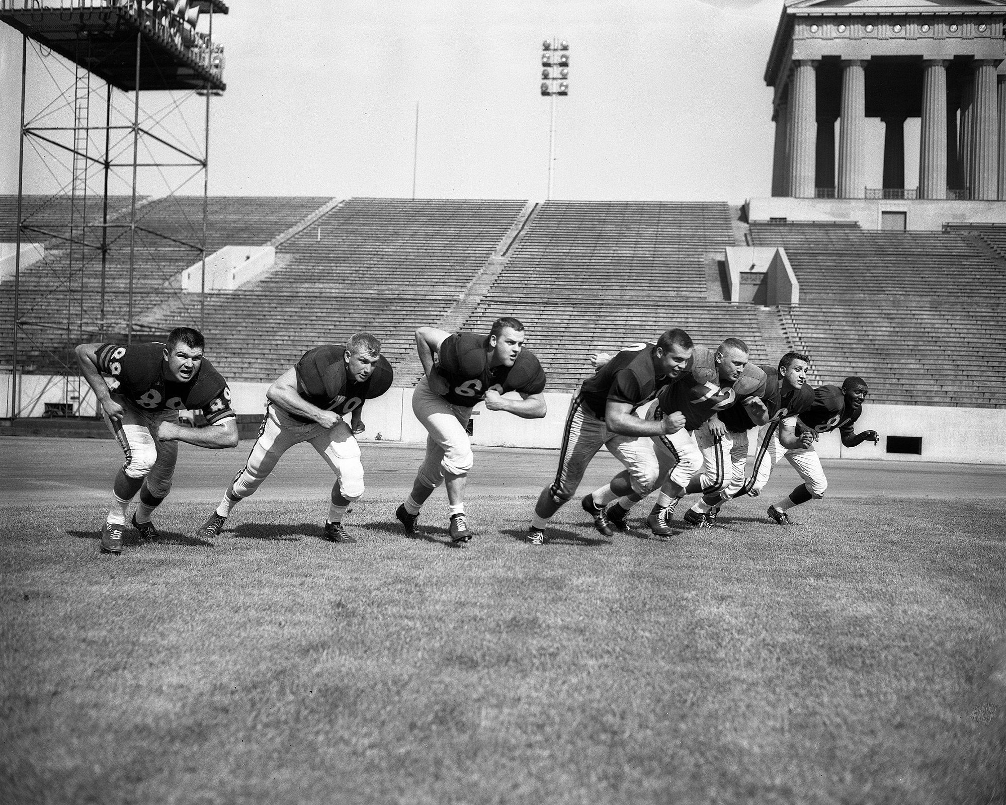 Professional football player and coach, Mike Ditka, was born on October 18, 1939 In Carnegie, PA. Image of Chicago Bears tight end Mike Ditka on the far left with teammates during a workout at Soldier Field in 1961 via Wikimedia Commons, public domain.