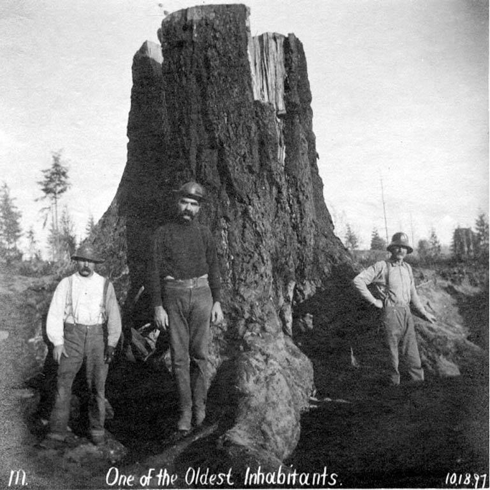 Three men standing by large tree stump, Puget Sound Navy Yard, October 18, 1897 via Wikimedia Commons, public domain.