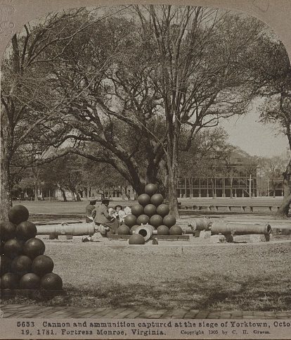 Photo taken at Fortress Monroe, Virginia from 1905 showing cannon and ammunition captured at the siege of Yorktown on October 19, 1781. via LOC, no known restrictions
