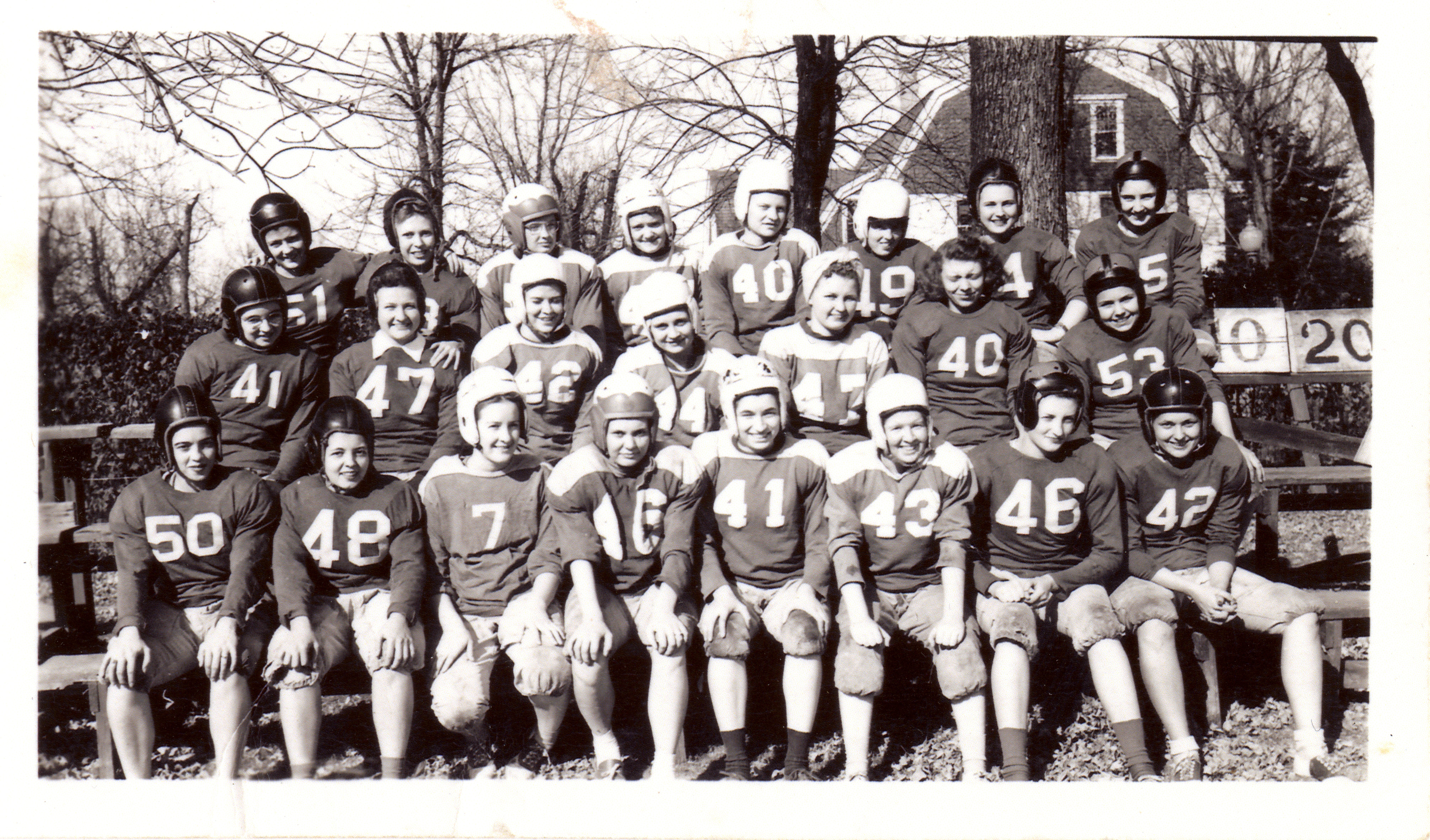 One of the first powderpuff football games was played on October 20, 1945 at Eastern State Teacher’s College in Madison, South Dakota. Image of Eastern State Women’s Football Team – October 20, 1945 via Wikimedia Commons, public domain