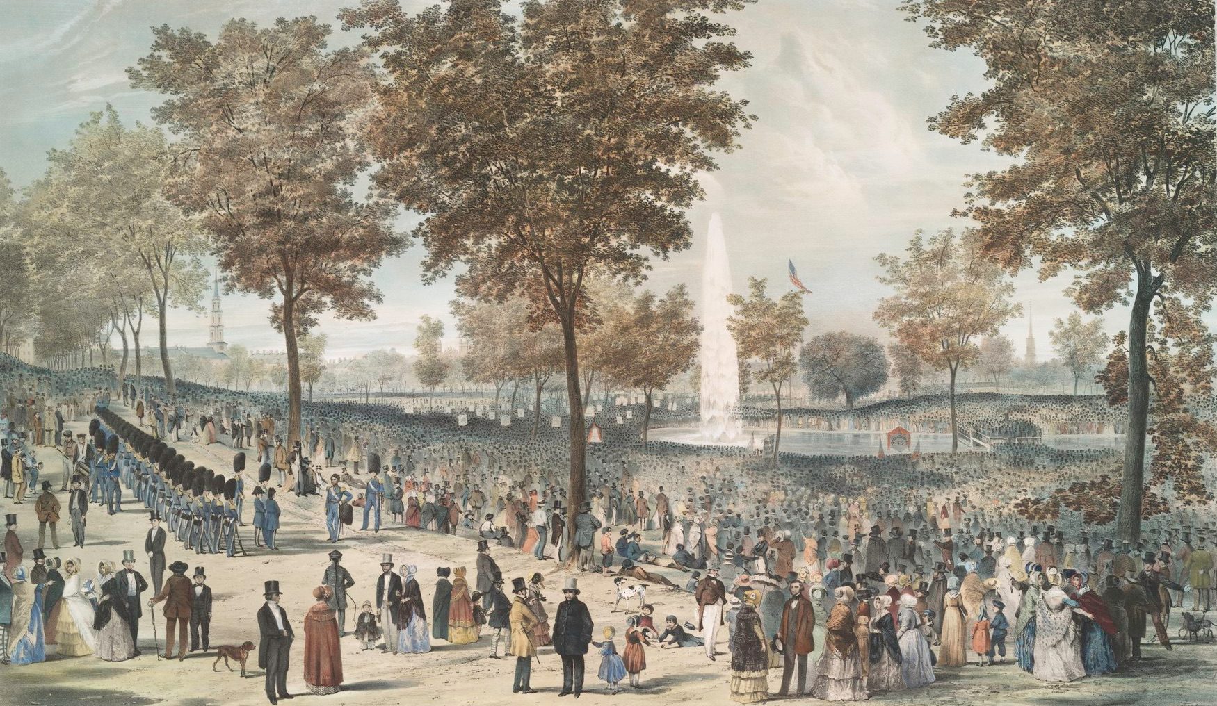 “View of the water celebration, on Boston Common October 25, 1848” via Wikimedia Commons, public domain