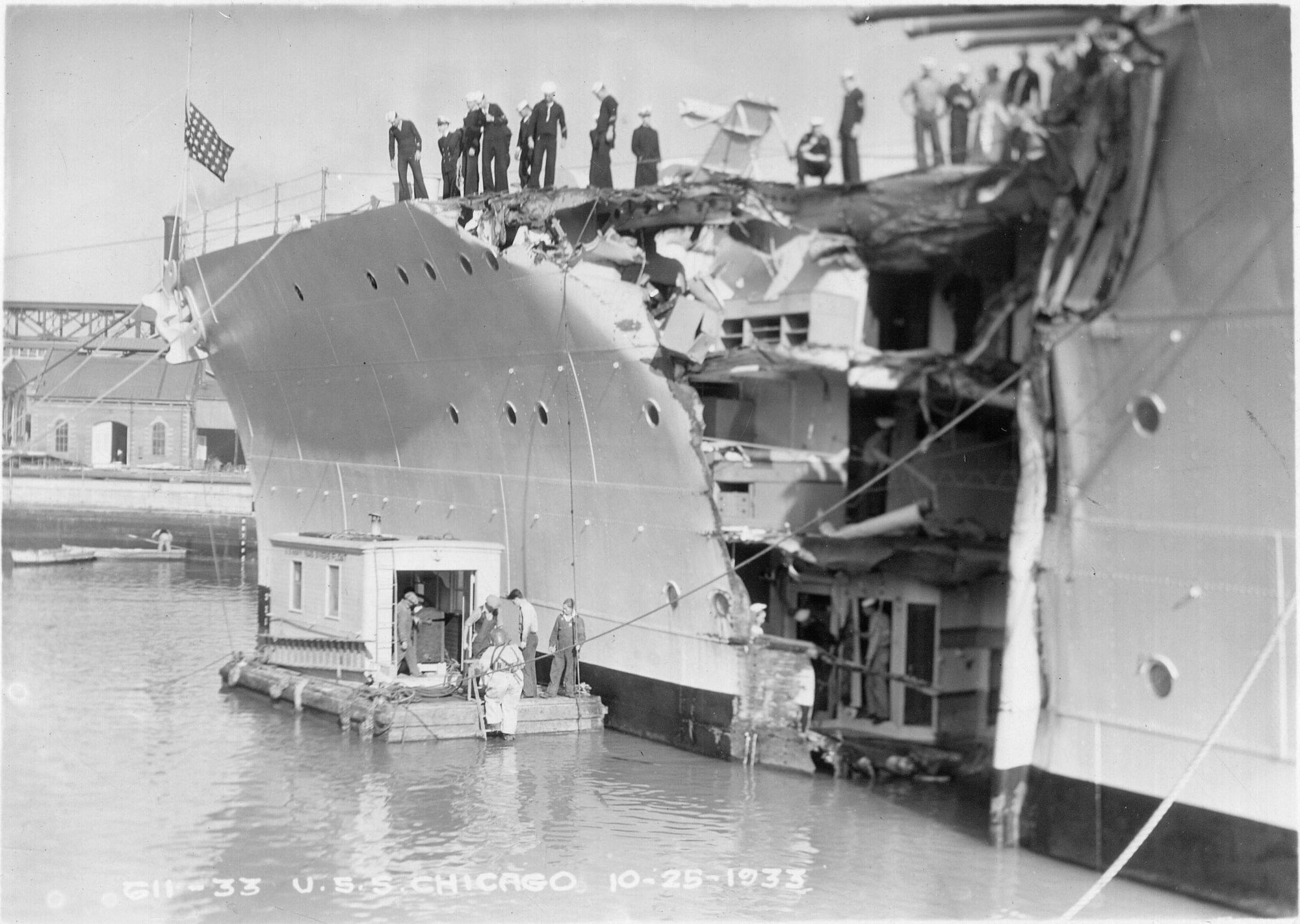 The damaged USS Chicago with Mare Island’s diving barge alongside at Mare Island Navy Yard on October 25, 1933 after her collision with the British freighter Silver Palm . via Wikimedia Commons, public domain