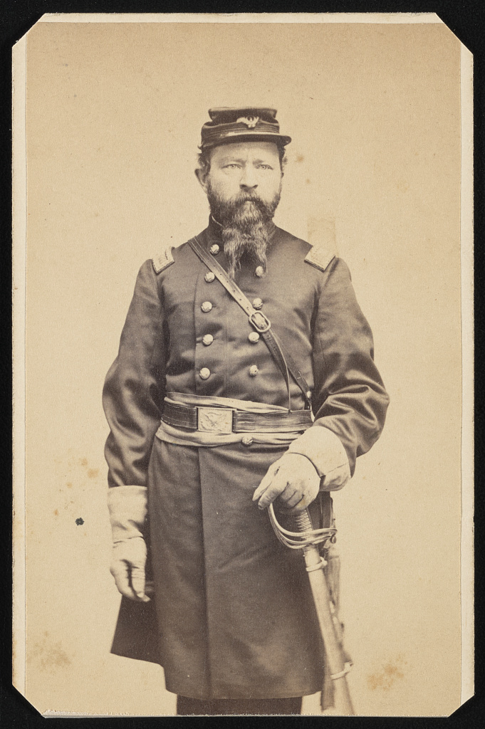 Brigadier General John Henry Holman of Co. I, 4th Missouri Infantry Regiment and 1st U.S. Colored Troops Infantry Regiment in uniform with sword. He was wounded on October 27, 1864 at Fair Oaks, Virginia.