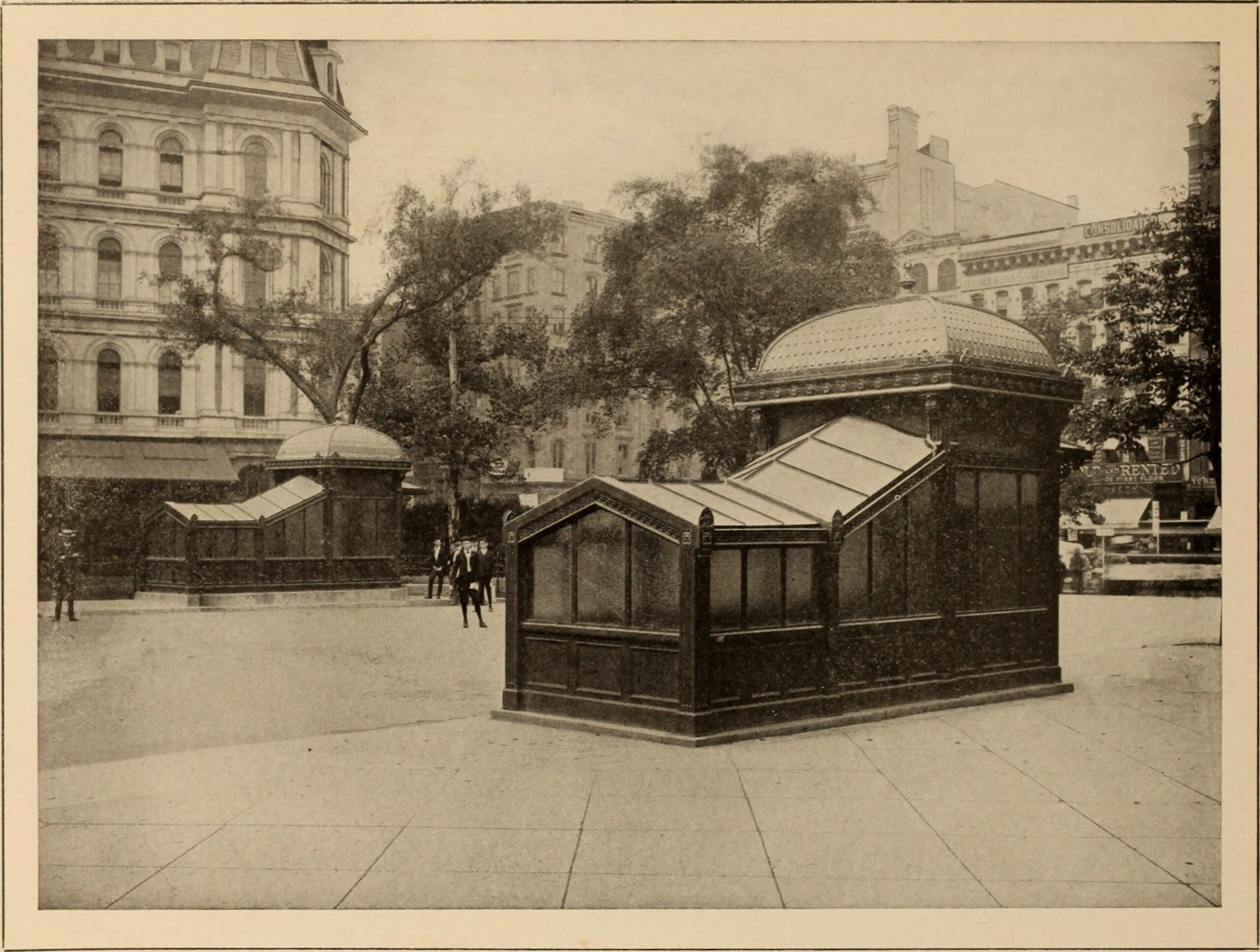 This image from a book from 1906 says: “The entrances and exits to the city’s underground rapid transit system are a new feature of the streets of the metropolis. They are substantially built and of pleasing design. The herculean undertaking was completed in 1904”