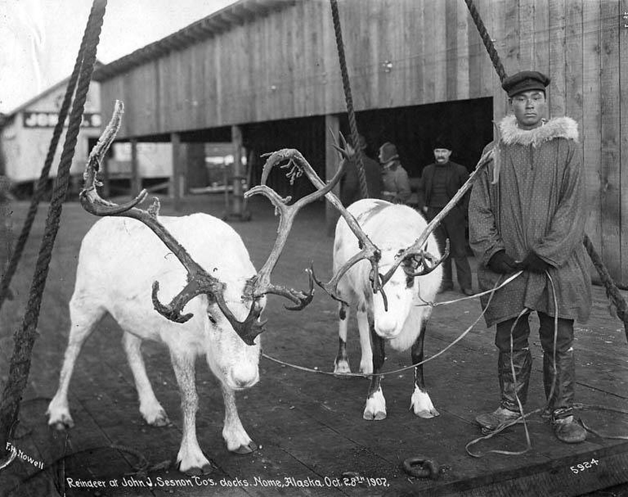F.H. Nowell Reindeer at John J. Sesnon Co’s. docks. Nome, Alaska. Oct. 28, 1907 Image via Wikimedia Commons, public domain