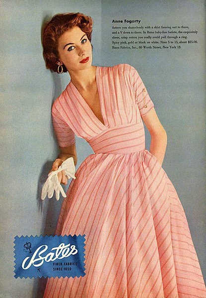 It was hard to open a magazine from 1947 until the late 50s and not see ads featuring Suzy Parker, born October 28, 1932. Tall, with red hair and green eyes, Parker was the first model to earn $100,000 in a year and appeared on the covers of 70 magazines. She’s shown here in 1952 advertising fabrics. Image via Wikimedia Commons, no known copyright, public domain in the US.