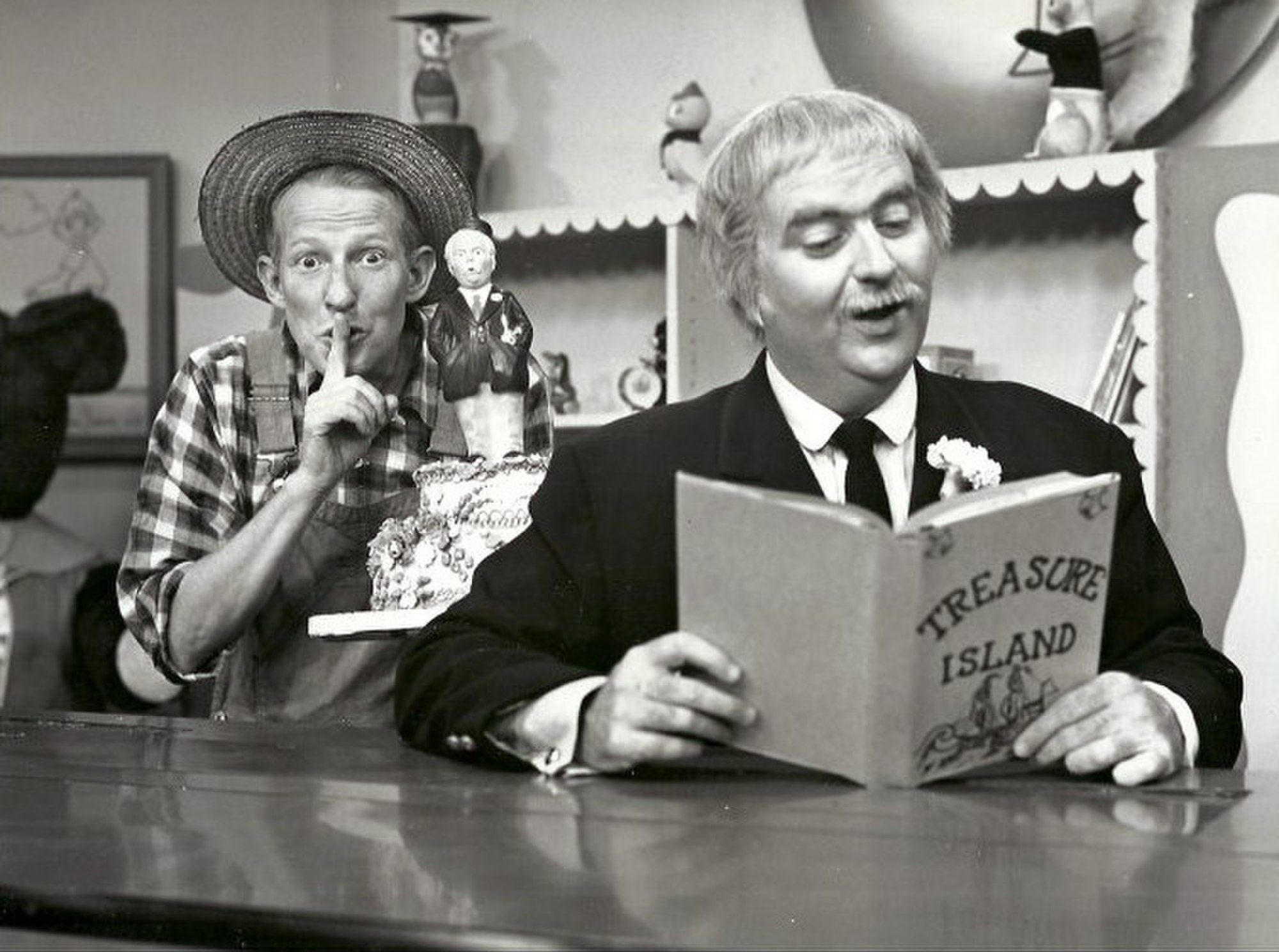 On October 3, 1955 Captain Kangaroo debuted on network television. Image: Hugh Brannum (Mr. Green Jeans) secretly reveals a five year anniversary cake behind Bob Keeshan (Captain Kangaroo) in 1960 via Wikimedia Commons, public domain