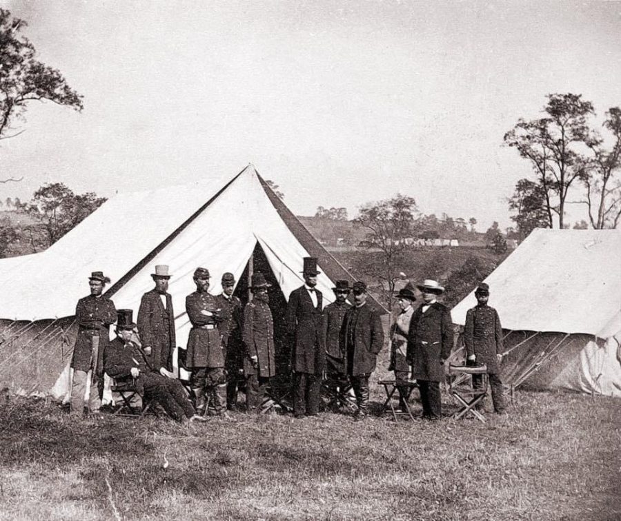 Abraham Lincoln and others at Antietam Lincoln’s bodyguard, Ward Hill Lamon, is seated on the left – October 3, 1862 via Wikimedia Commons, public domain