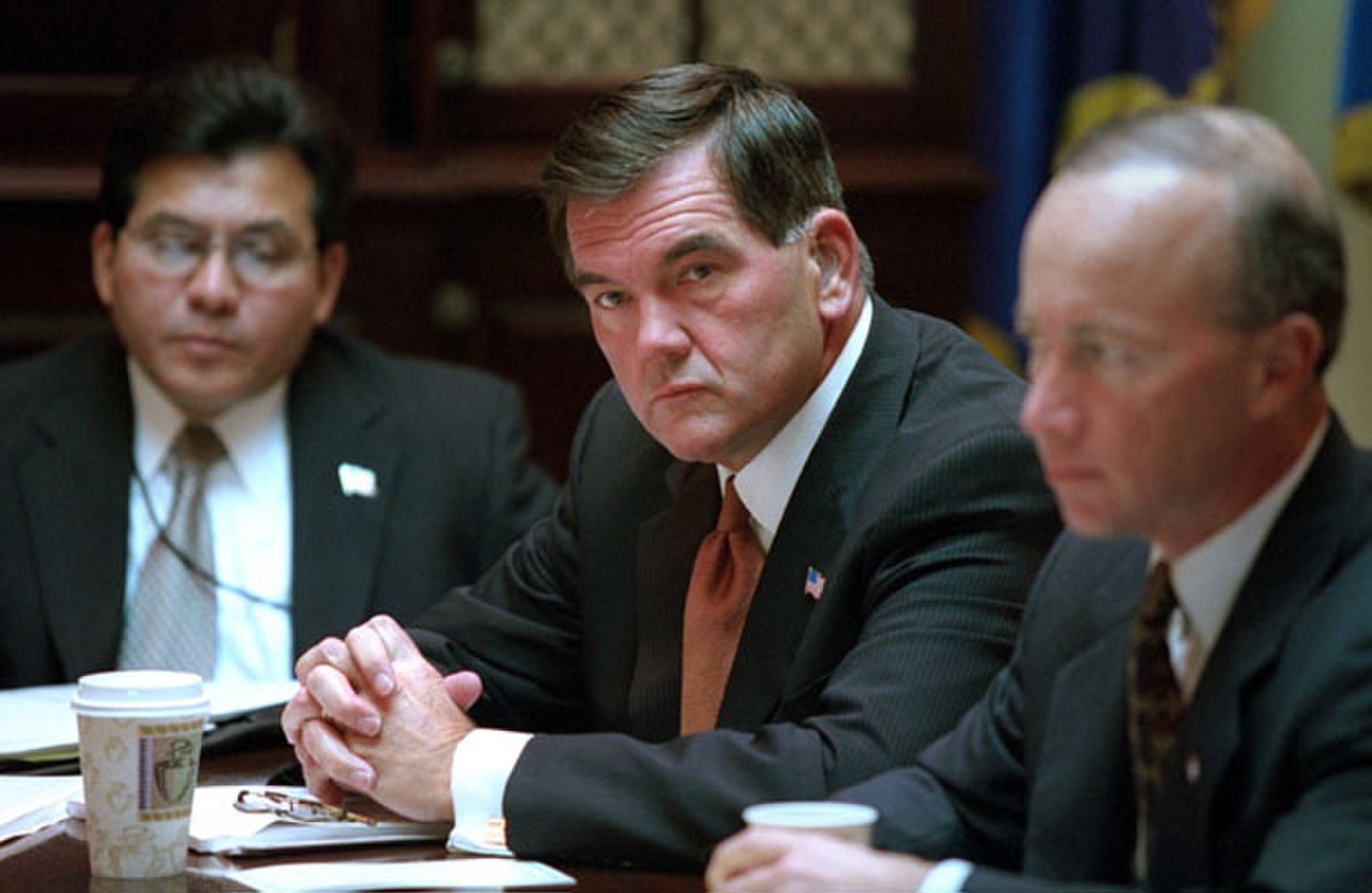 Vietnam Veteran Tom Ridge was sworn in as the first U.S. Homeland Security Advisor on October 8, 2001. He resigned as Governor of Pennsylvania three days earlier. Image of Tom Ridge at The White House on October 8, 2001 via Wikimedia Commons, public domain
