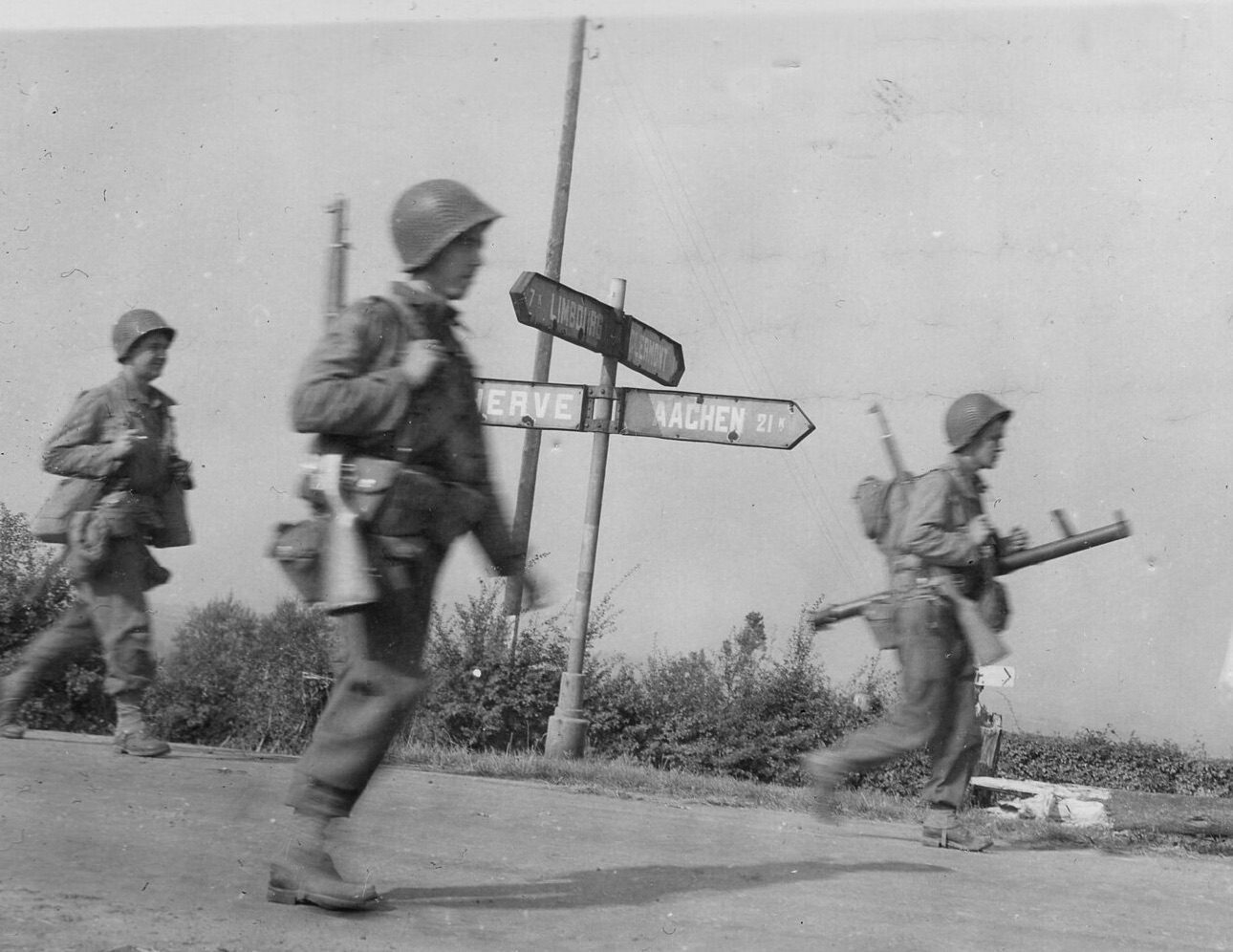 An American bazookaman and two riflemen of the infantry advance past road signs toward enemy positions in the Siegfried line. Belgian border area September 12, 1944 Image via Wikimedia Commons, public domain