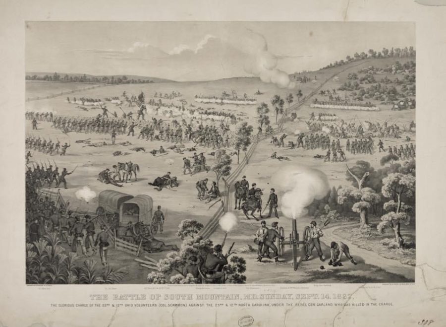 A depiction of The Battle of South Mountain, Maryland – September 14, 1862 “The Twenty-third Ohio Regiment was under the command of Lieut.-Col. Rutherford B. Hayes. Strangely enough, the little commissary sergeant (William McKinley) and the acting colonel were drawn toward each other as by a kinship of destiny. They had occasion to meet each other constantly, and each found something sympathetic in the heart and conduct of the other. They became brothers in heart by an invisible kinship. The boy sergeant came to love his colonel. Well he might, for Colonel Hayes was a clear-cut gentleman of culture, conscience, and high purpose. Persons gravitate toward those who have like aims, and like aims make a like destiny. The Twenty-third Ohio Regiment was ordered to Washington to participate in the impending struggles at South Mountain and Antietam to prevent General Lee from invading the North. It soon faced fire at South Mountain. Colonel Hayes was among the first to be wounded, and continued to fight while bleeding. Three bayonet charges were made by the regiment, and it lost two hundred men. The colors of the regiment were riddled. From: The young McKinley; or, School-days in Ohio; a tale of old times on the Western Reserve by Hezekiah Butterworth, published in 1905 https://archive.org/details/youngmckinleyors00butt/page/239 Image via Wikimedia Commons, public domain