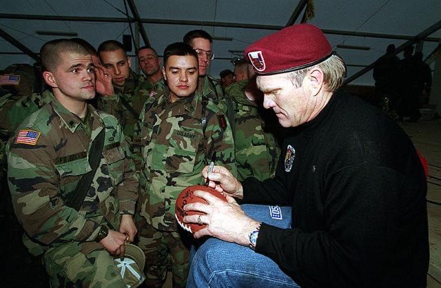 Image: Bradshaw autographs a football for an American soldier in Kosovo in 1999 via Wikimedia Commons, public domain