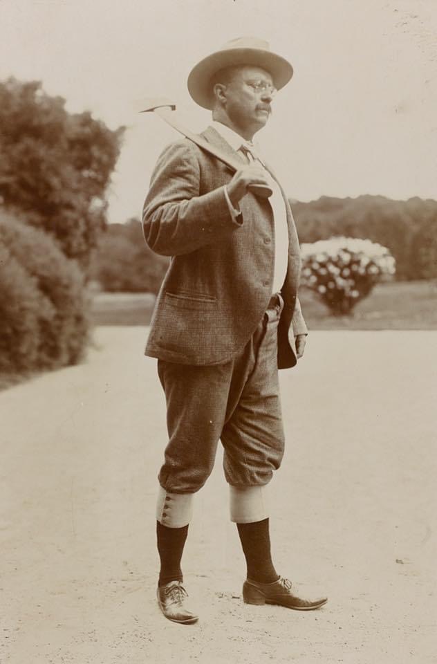 Image: Theodore Roosevelt wearing knickerbockers and carrying an axe on his shoulder, later that same September in 1901
