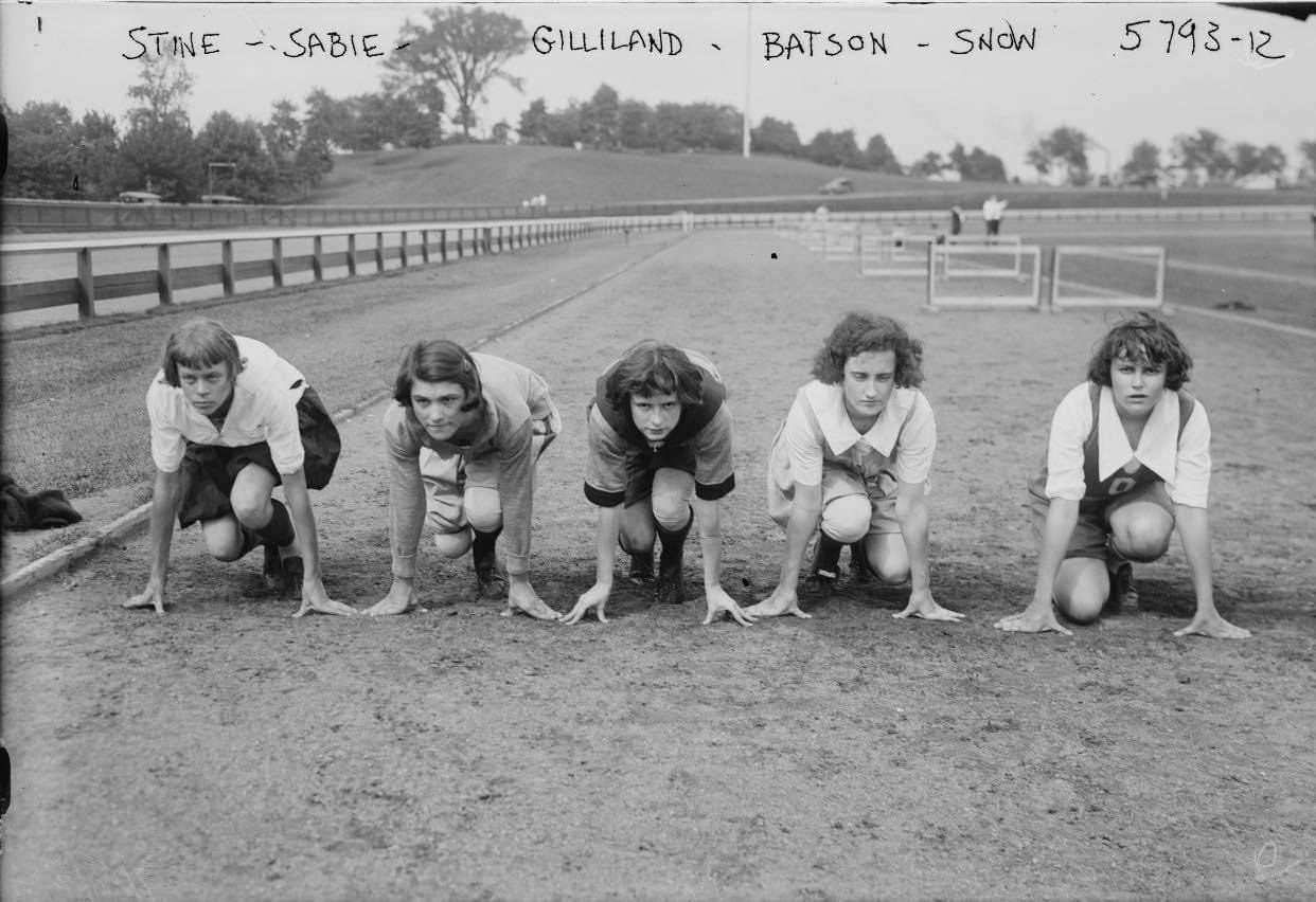 Female athletes make their mark at Weequahic Park in Newark, New Jersey to train for the 1922 Women’s World Games in Paris. The following year on September 29, 1923 the first American track and field championships for women were held at Weequahic Park in Newark, New Jersey. Image via Wikimedia Commons, public domain