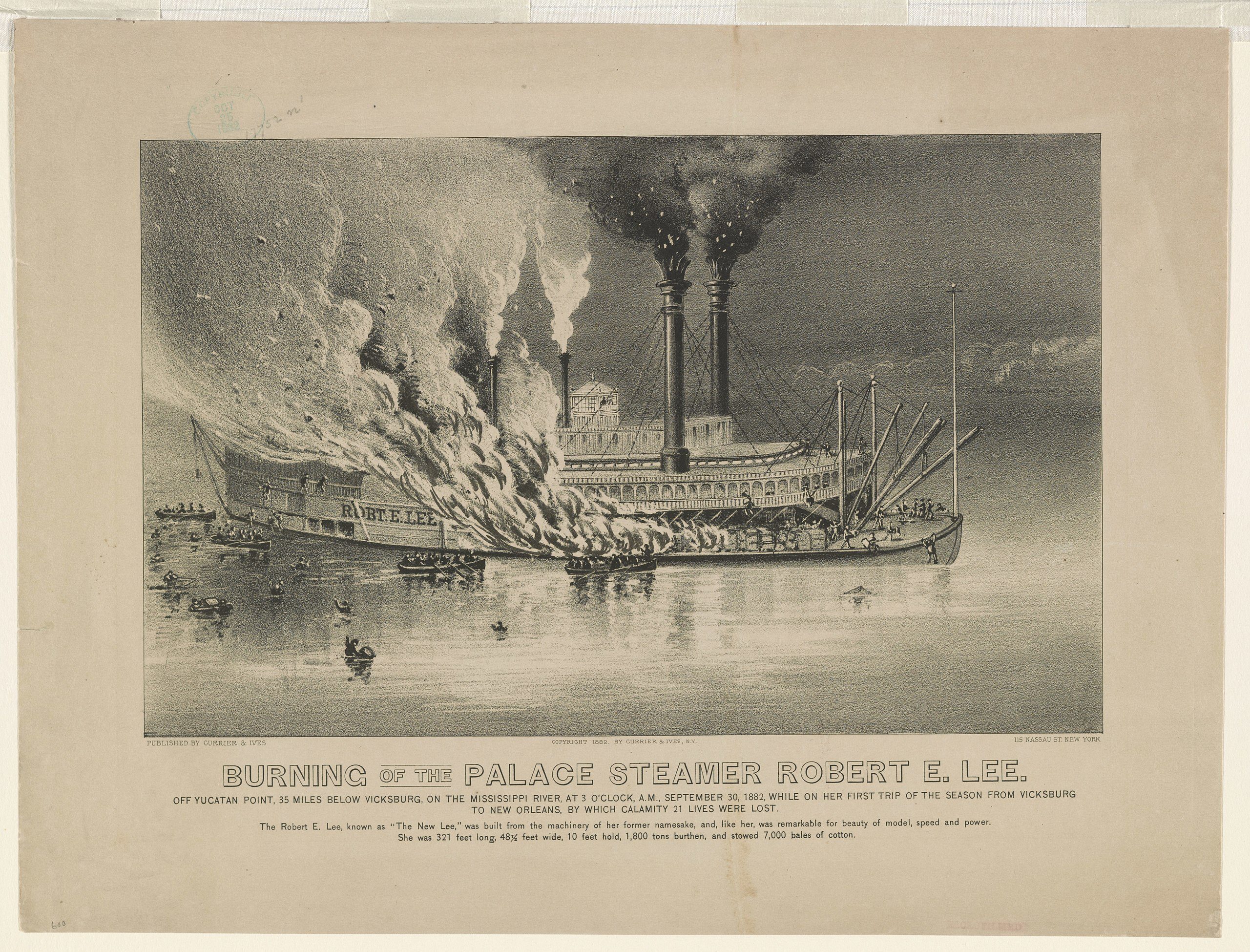 “Burning of the Palace Steamer Robert E. Lee: Off Yucatan Point, 35 miles below Vicksburg, on the Mississippi River, at 3 o’Clock, A.M., September 30, 1882, while on her first trip of the season from Vicksburg to New Orleans, by which calamity 21 lives were lost” Image from 1882 via Wikimedia Commons, public domain