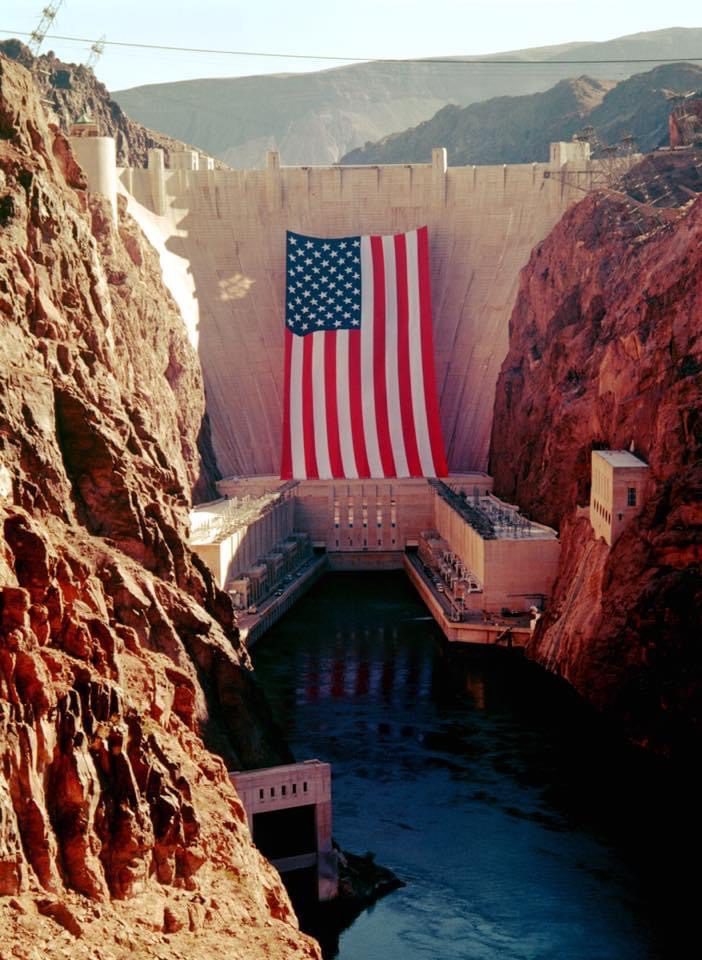 On September 30, 1935 “Boulder Dam” was dedicated. During the Truman Administration, Congress officially restored the name “Hoover Dam” in 1947. Image: An over 500ft long American Flag hanging over the face of the Hoover Dam in 1996 via Wikimedia Commons, public domain