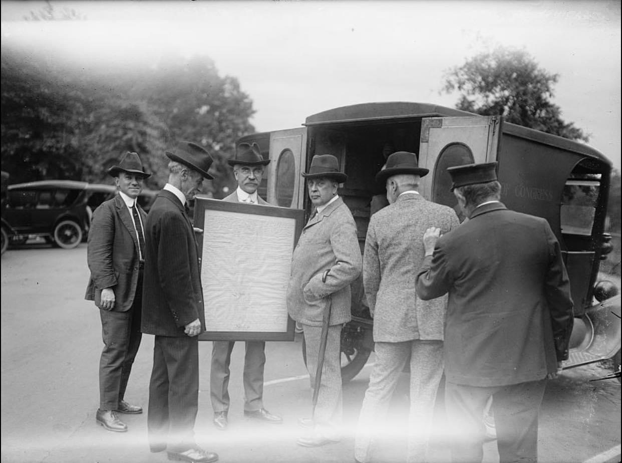 On September 30, 1921 original copies of The Declaration of Independence and the United States Constitution were removed from the Department of State and transferred to the Library of Congress. Image: Removal of The U.S. Constitution via Library of Congress on 9/30/1921, no known restrictions
