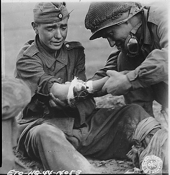 Amid the chaos of war, this photograph—taken on September 6, 1944—captures a moment of mercy. A young Nazi soldier, likely still in his teens, sits wounded and subdued. An American serviceman kneels beside him, tending to the injury with calm and care while awaiting a medic.