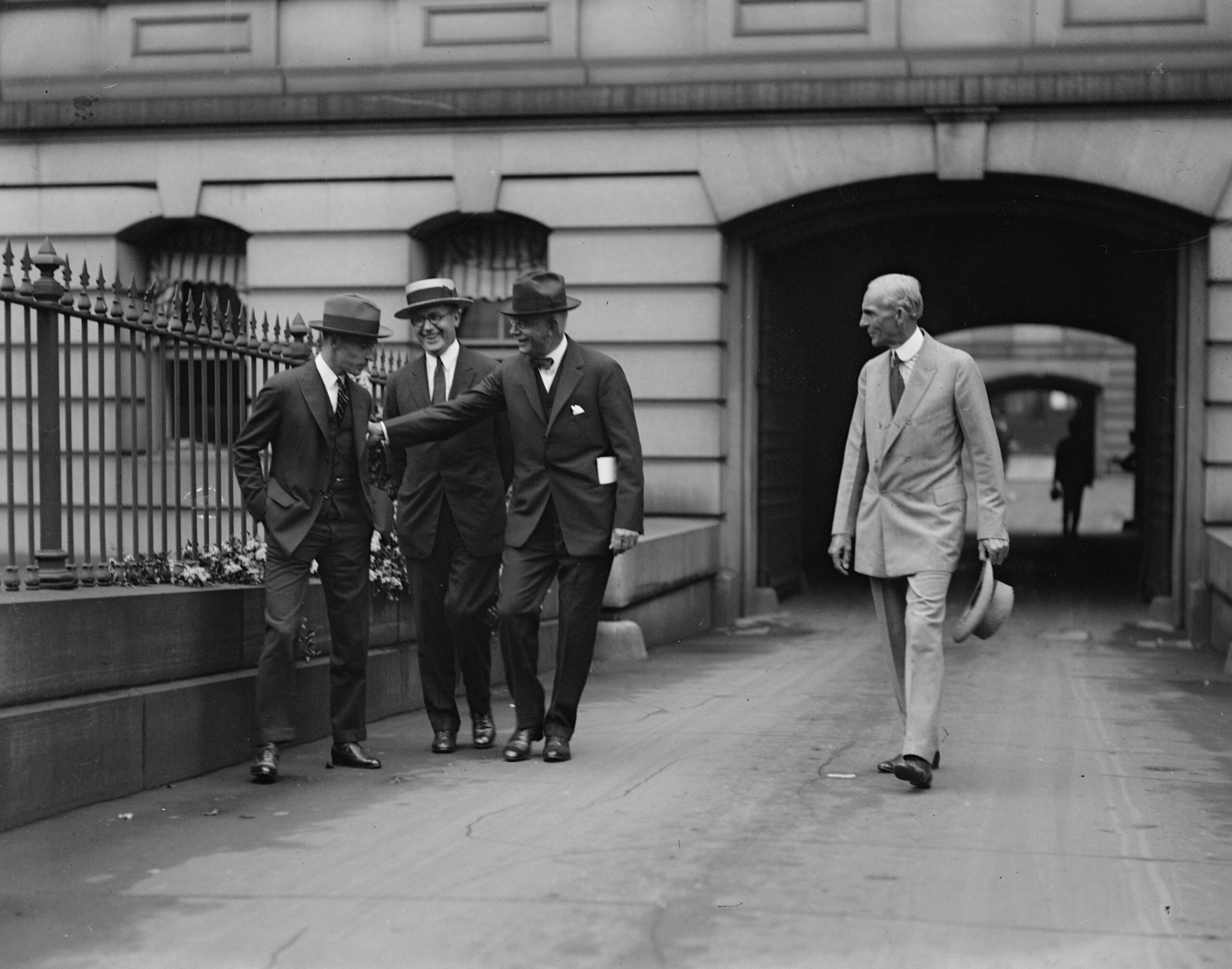 Photograph of Henry Ford, with a seemingly puzzled look on his face, as he walks by three men in suits who are having a laugh.