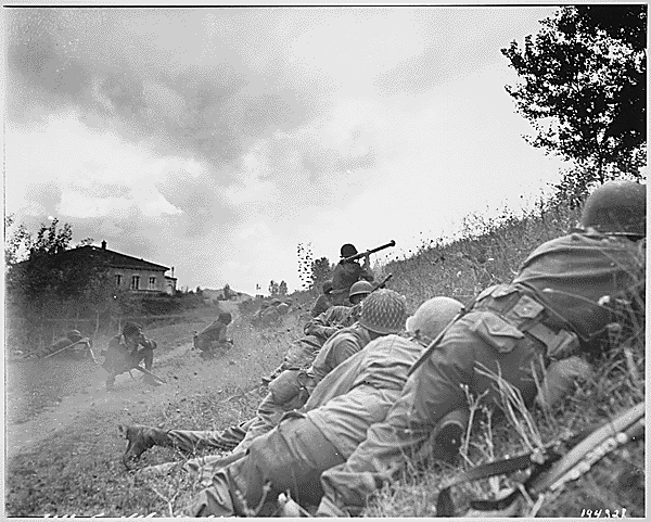 An American patrol advances three miles north of Lucca, Italy to contact an enemy machine gun nest. Here a soldier with a bazooka cuts loose at the target some 300 yards away.