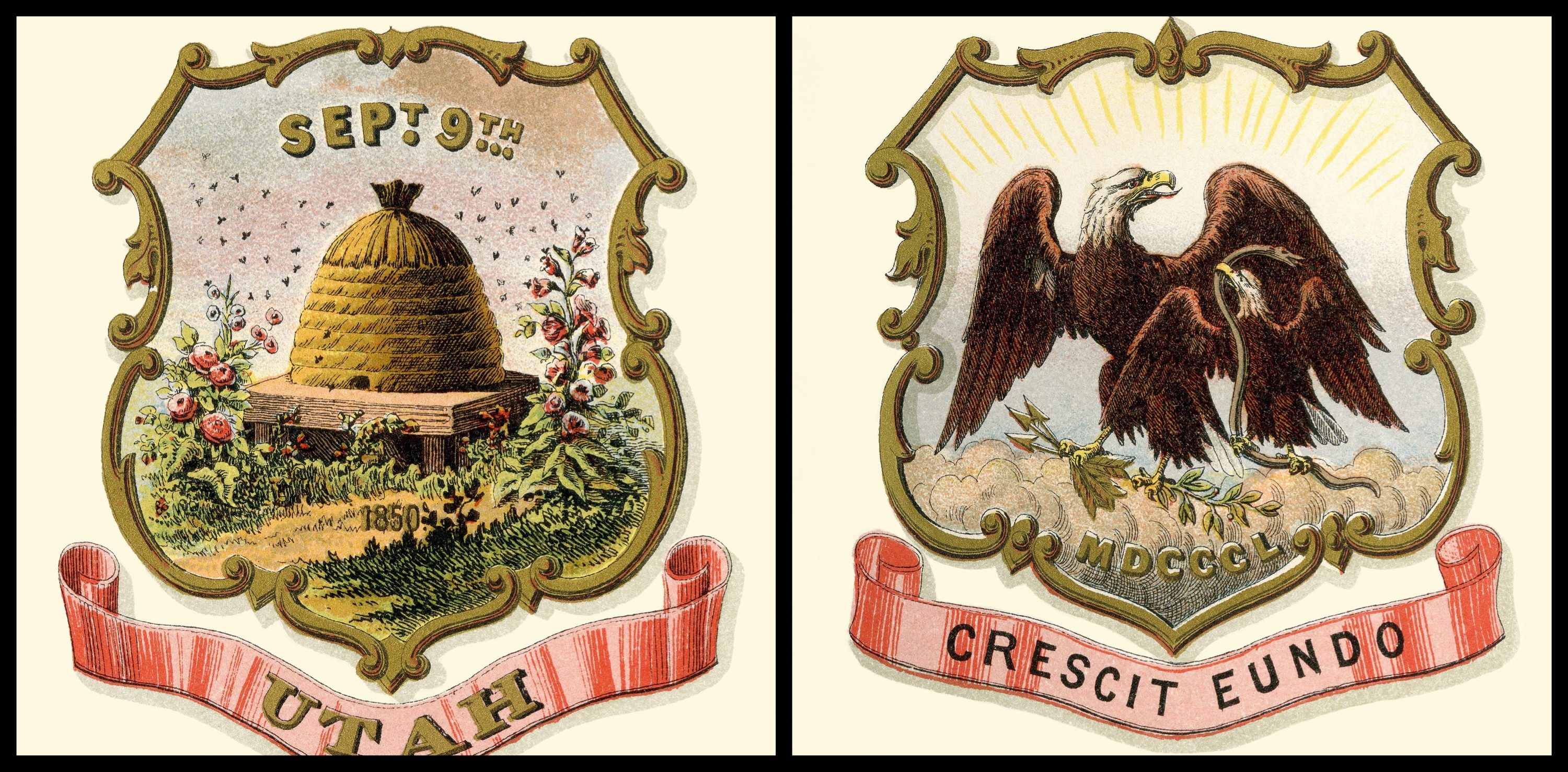 Images: The coat of arms of the Territory of Utah and the coat of arms of the Territory of New Mexico via Wikimedia Commons, public domain