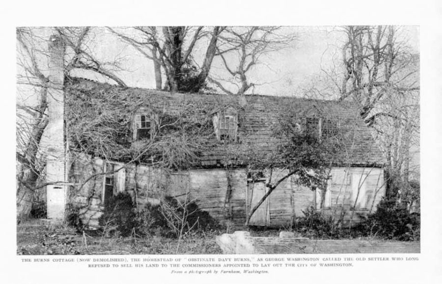 “The Burns Cottage (now demolished), the Homestead of ‘Obstinate Davy Burns,’ as George Washington called the old settler who long refused to sell his land to the commissioners appointed to lay out the City of Washington.”