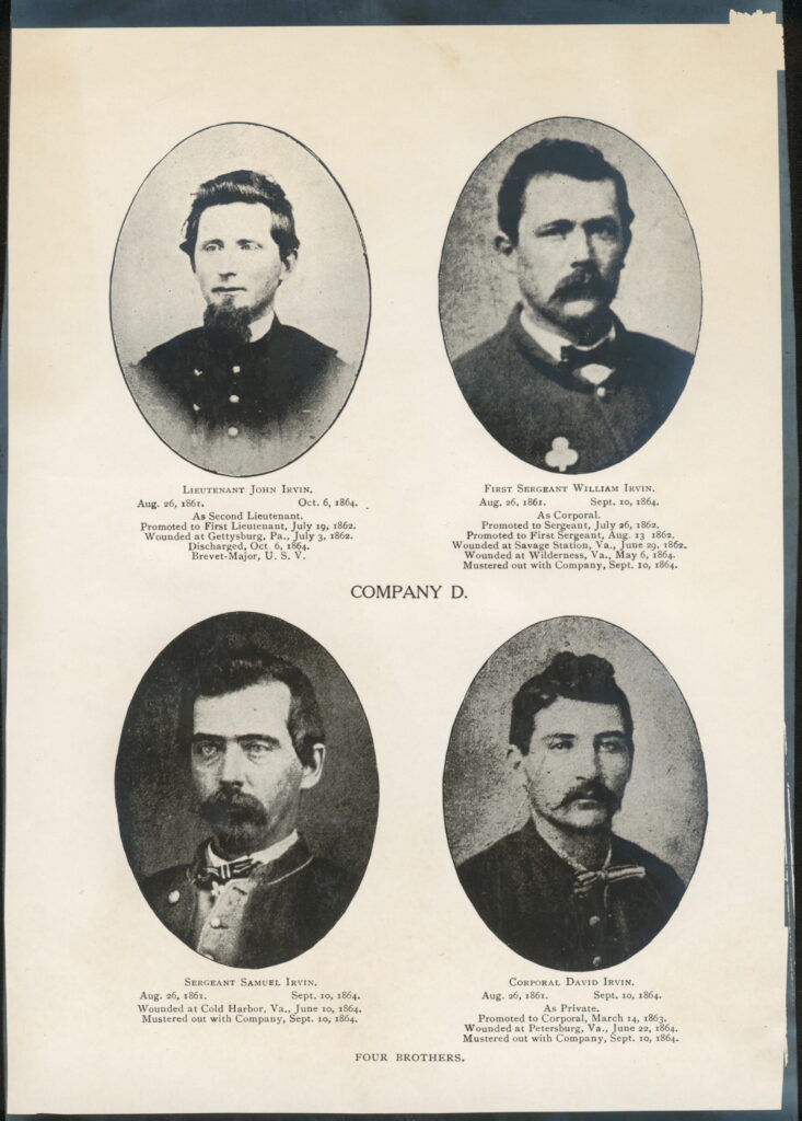 And then there were the Irvins of Company D—four brothers from the same Philadelphia household who stepped into the photographer’s studio in their new uniforms, the war still only a rumor. Their oval portraits, posed with the solemnity the era demanded, carry the story of Irish Philadelphia more clearly than any muster roll: four sons offering themselves together, believing that courage on the field might finally earn their people a place in a city that had not always welcomed them. Their faces—steady, unsmiling, almost ceremonial—stand as the quiet center of the regiment’s story, the moment where an immigrant community’s hopes and hardships resolve into the lives of real men preparing to march.