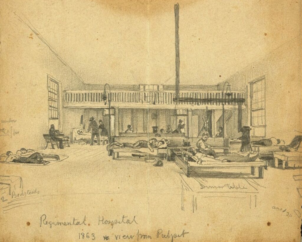 And somewhere in Philadelphia—often in a church hastily converted into a ward—men like the Irvins would return when the war finally touched their bodies. The city raised the regiment, and it received its wounded back again, rowhouses emptying into makeshift hospitals where pews became beds and surgeons worked beneath stained‑glass windows. A drawing from 1863 shows one of these regimental hospitals: long rows of cots, blankets pulled to chests, the pulpit still visible above the wounded. It is not marked as the 116th’s, but it might as well be. The same streets that sent four brothers into Company D would have carried them here after Savage Station, Gettysburg, Cold Harbor, Petersburg—each wound a reminder of how deeply the war reached into Philadelphia’s Irish homes.