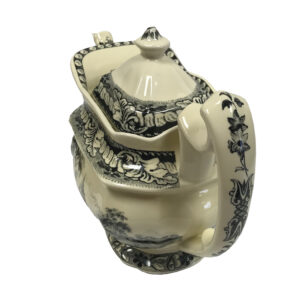 Impress family and friends with this authentic-looking, 18th-century style porcelain antique reproduction teapot with the time-tested, transfer printing process. This black and white design depicts a man and woman fishing in a pond by their beautiful estate.