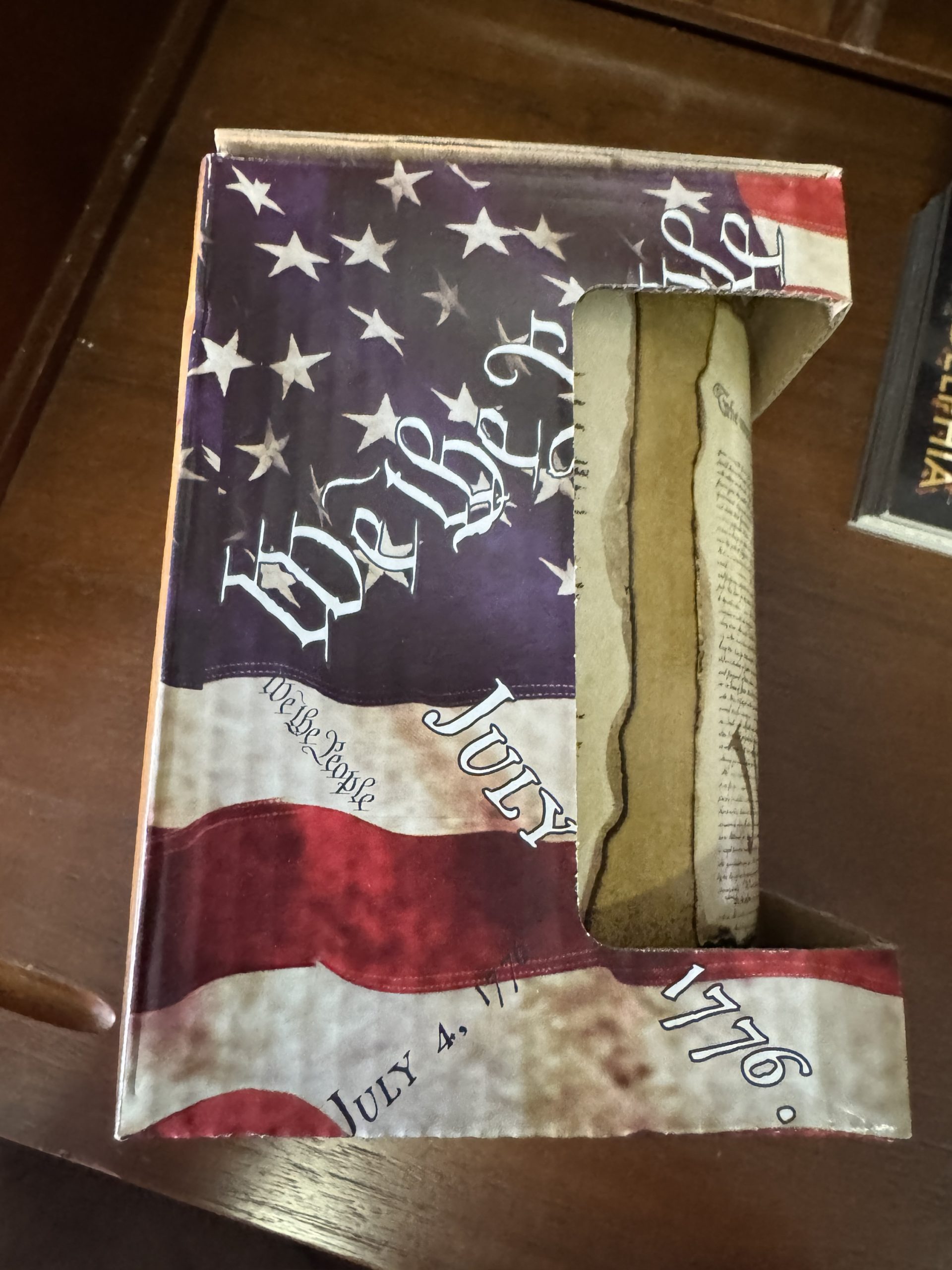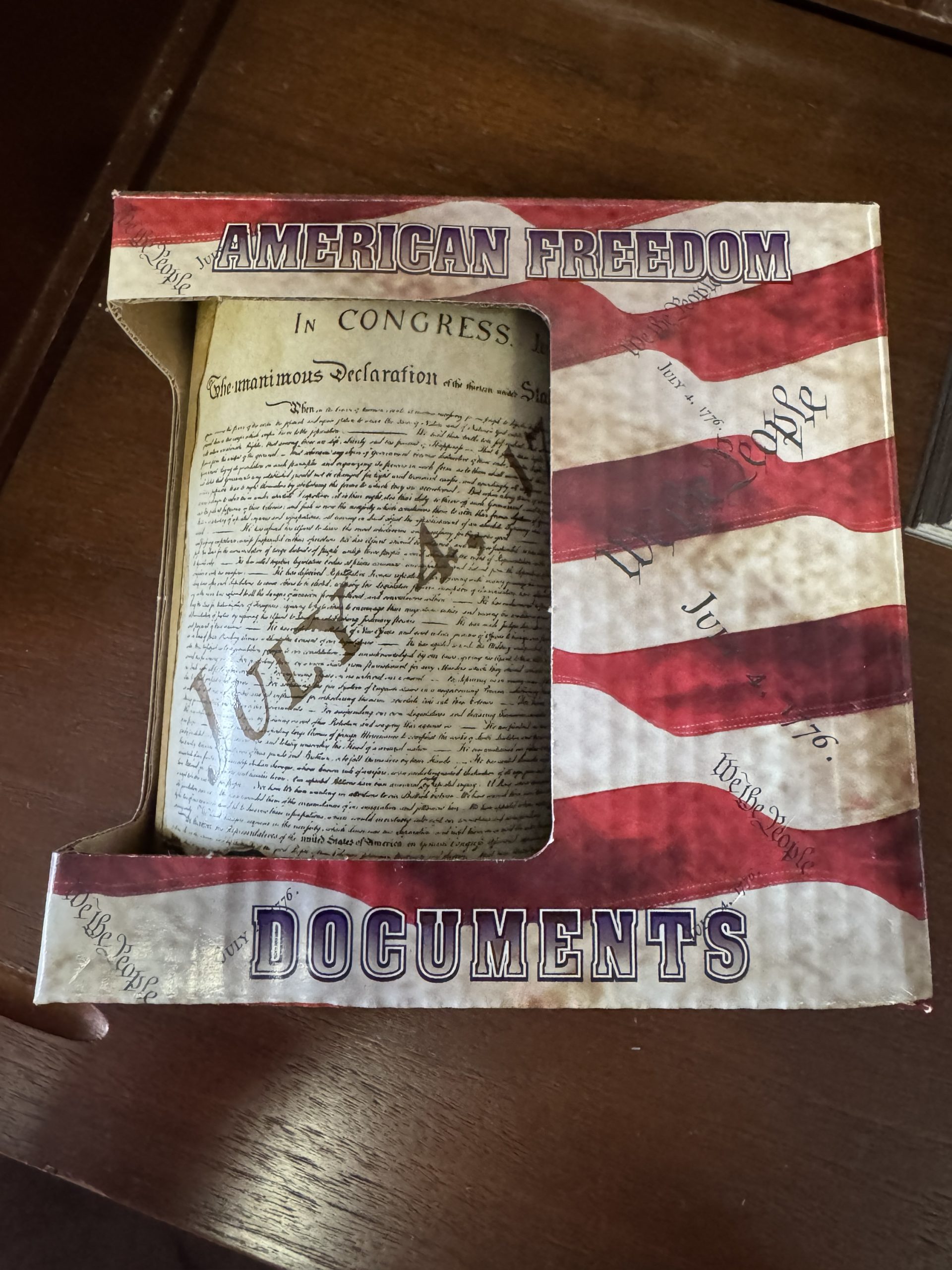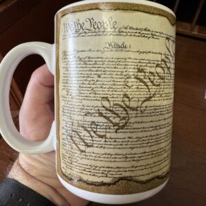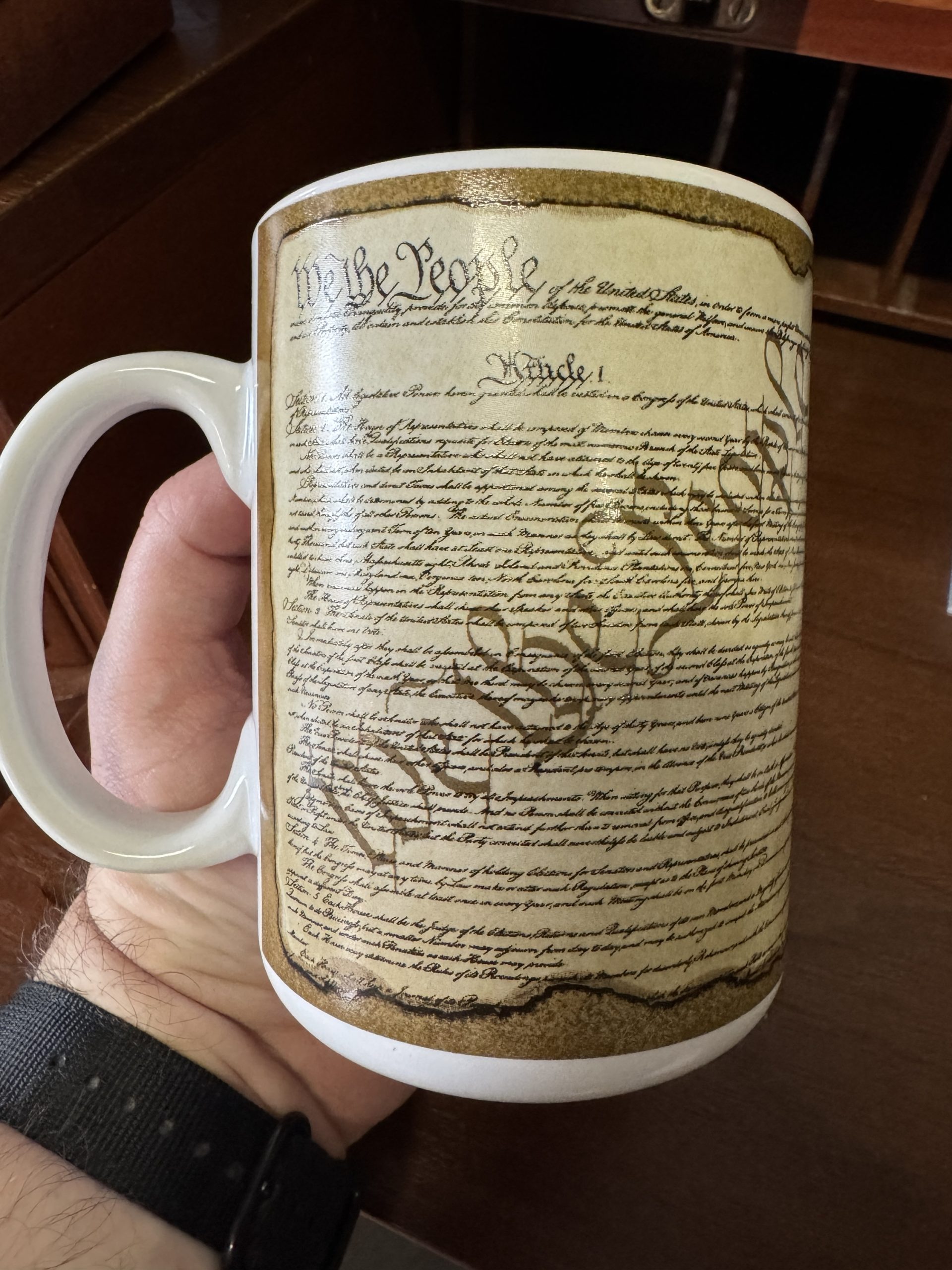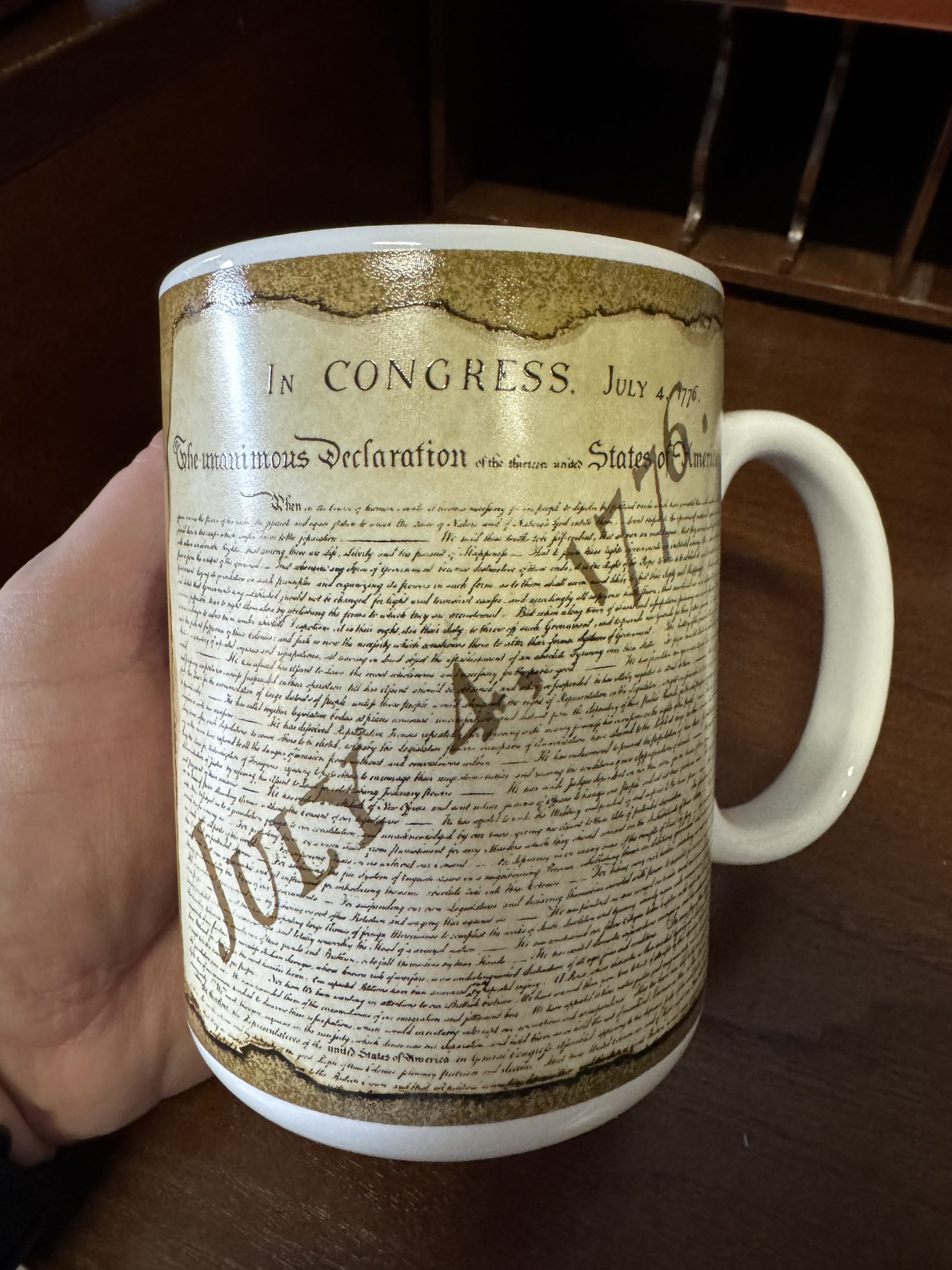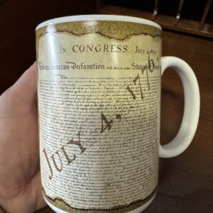 Large mug featuring the Declaration of Independence and U.S. Constitution. Comes in a handsomely designed box.