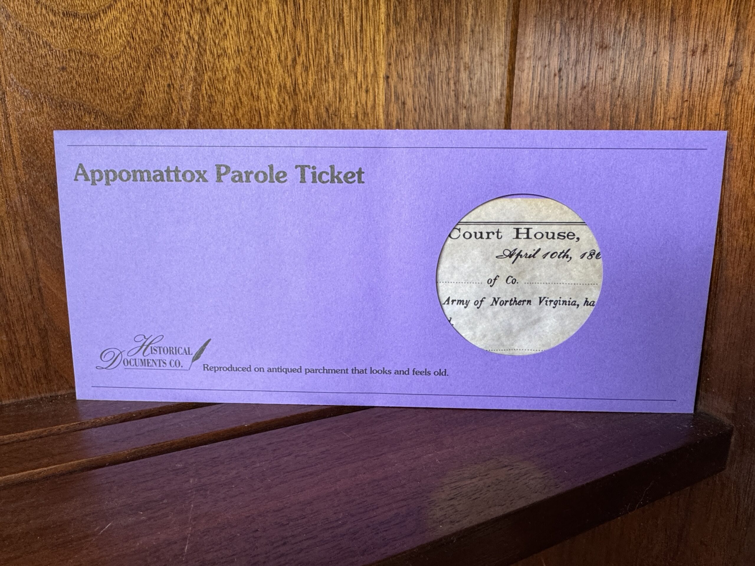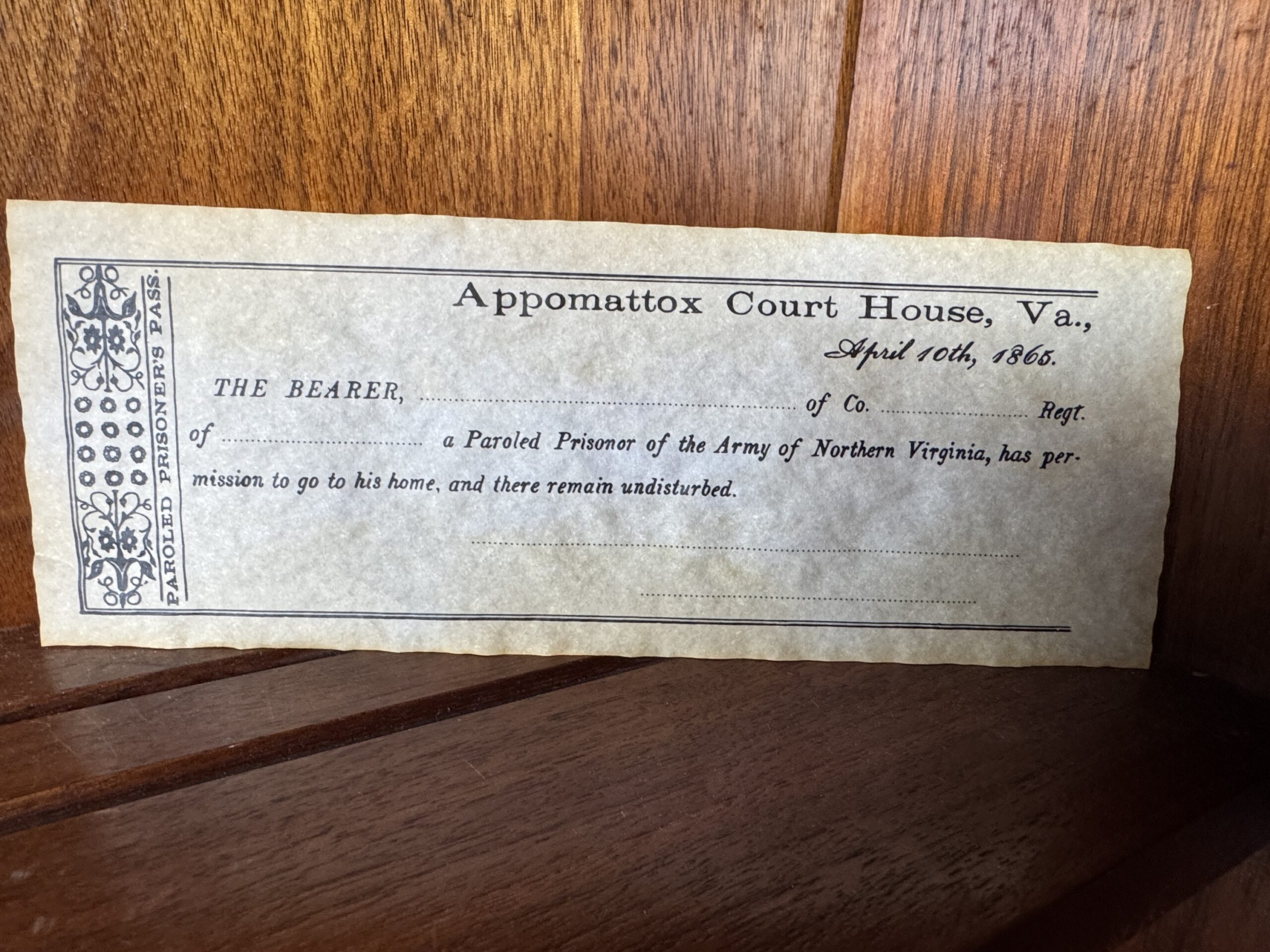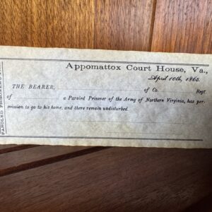 This Appomattox parole pass (replica) is one of the most consequential pieces of paper produced in American history. Issued on April 10, 1865, it granted a Confederate soldier safe passage home “undisturbed,” transforming the chaos of surrender into an orderly demobilization. Thousands like it were printed overnight at the Clover Hill Tavern, where Union soldiers worked in shifts to turn a small Virginia building into a factory of reconciliation. Each pass marked the precise moment a man stepped out of the war and reentered civilian life—proof that peace, in the end, was secured not only by generals, but by ink, paper, and administrative resolve.