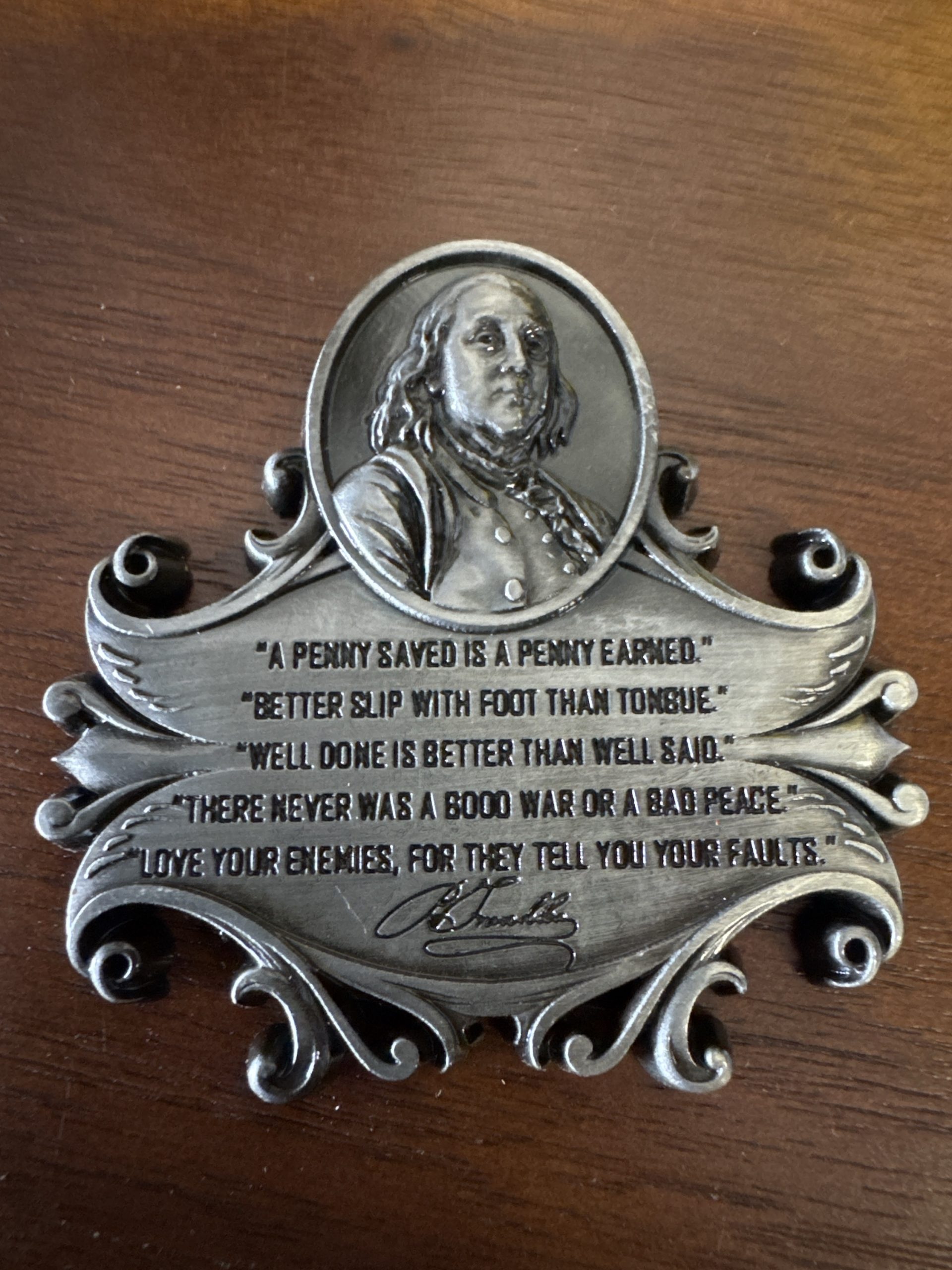 This compact yet commanding magnet brings Ben Franklin’s legendary wit to life in solid metal. At just 2 inches wide by 2¼ inches high, its brushed finish gives it the look of an antique plaque—like something salvaged from a revolutionary-era printing press. The quote, crisply engraved in bold serif type, captures Franklin’s timeless voice: clever, candid, and defiantly American.