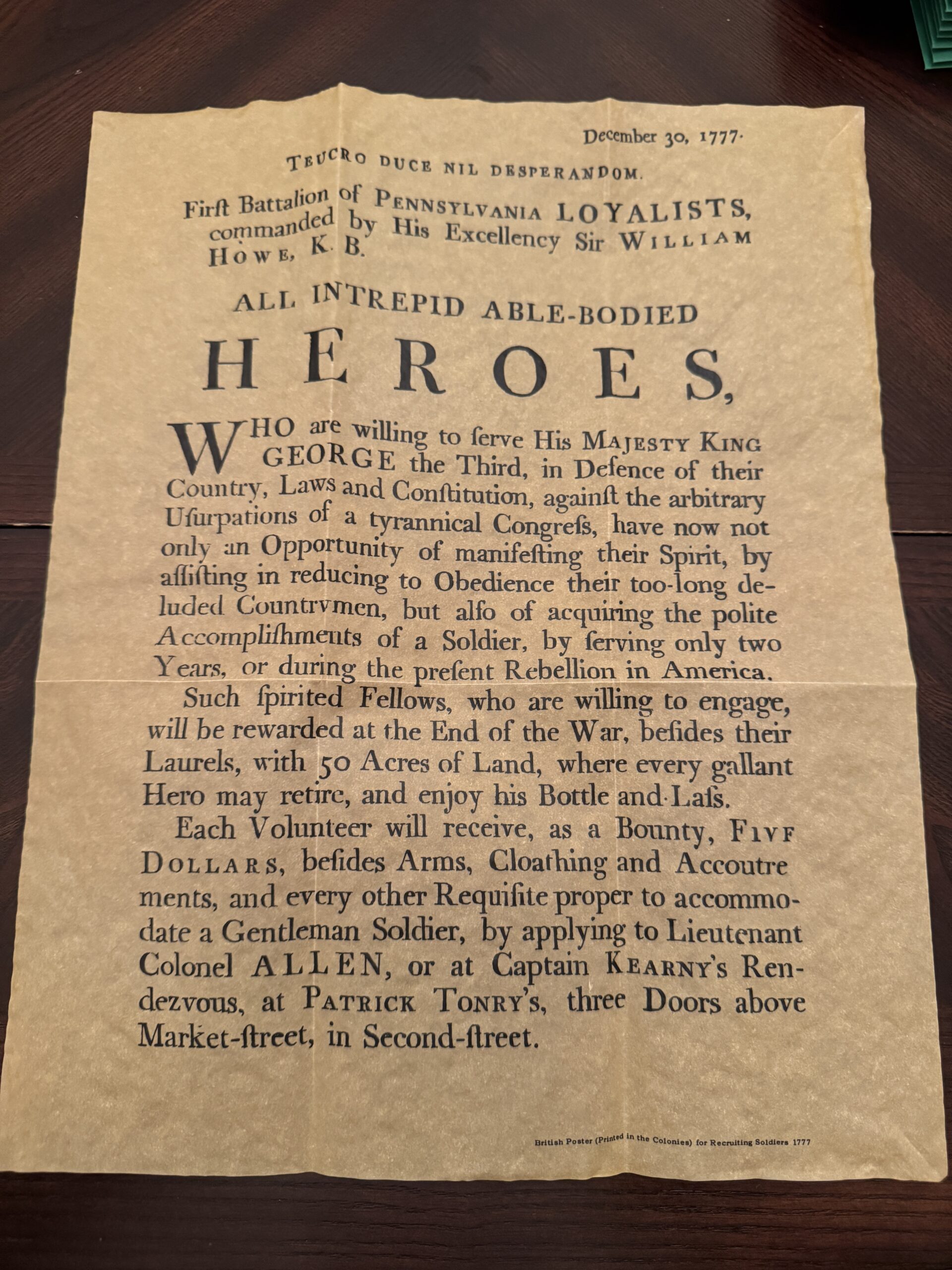 Printed in the Colonies, seeking local soldiers to fight against the Colonists.